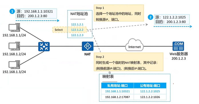 - Network Address and Port Translation 网络地址端口转换:从地址池中选择地址进行地址转换时不仅转换IP地址,同时也对端口号进行转换,从而实现公有地址与私有地址的1:n映射,可以有效提高公有地址利用率。