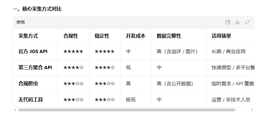 - 核心商品评论:通过官方 JOS API 获取(合规稳定)