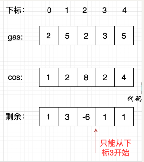 首先如果总油量减去总消耗大于等于零那么一定可以跑完一圈,说明 各个站点的加油站 剩油量rest[i]相加一定是大于等于零的。每个加油站的剩余量rest[i]为gas[i] - cost[i]。