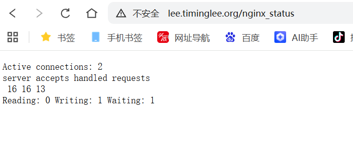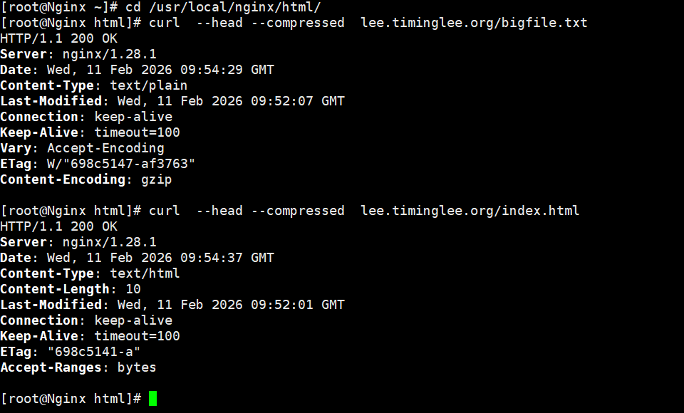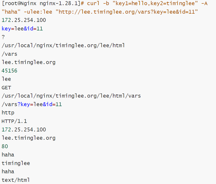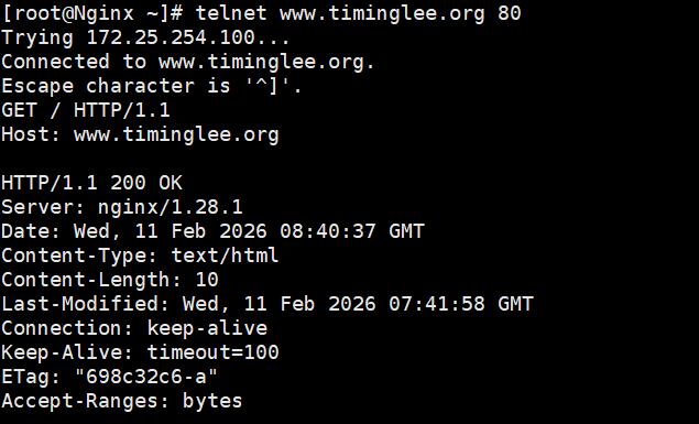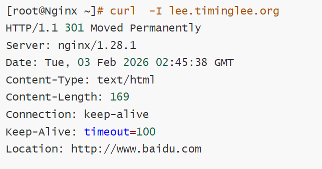 root@Nginx \~\]# wget https://nginx.org/download/nginx-1.28.1.tar.gz 2.解压 \[root@Nginx \~\]# tar zxf nginx-1.28.1.tar.gz \[root@Nginx \~\]# cd nginx-1.28.1/ \[root@Nginx nginx-1.28.1\]# ls auto CHANGES.ru conf contrib html man SECURITY.md CHANGES CODE_OF_CONDUCT.md configure CONTRIBUTING.md LICENSE README.md src 3.检测环境 #安装依赖性 \[root@Nginx \~\]# dnf install gcc openssl-devel.x86_64 pcre2-devel.x86_64 zlib-devel -y \[root@Nginx nginx-1.28.1\]# ./configure --prefix=/usr/local/nginx --user=nginx --group=nginx --with-http_ssl_module --with-http_v2_module --with-http_realip_module --with-http_stub_status_module --with-http_gzip_static_module --with-pcre --with-stream --with-stream_ssl_module --with-stream_realip_module 4.编译 \[root@Nginx nginx-1.28.1\]# make \[root@Nginx nginx-1.28.1\]# make install 5.nginx启动 #设定环境变量 \[root@Nginx sbin\]# vim \~/.bash_profile export PATH=$PATH:/usr/local/nginx/sbin \[root@Nginx sbin\]# source \~/.bash_profile \[root@Nginx logs\]# useradd -s /sbin/nologin -M nginx \[root@Nginx logs\]# nginx \[root@Nginx logs\]# ps aux \| grep nginx root 44012 0.0 0.1 14688 2356 ? Ss 17:01 0:00 nginx: master process nginx nginx 44013 0.0 0.2 14888 3892 ? S 17:01 0:00 nginx: worker process root 44015 0.0 0.1 6636 2176 pts/0 S+ 17:01 0:00 grep --color=auto nginx #测试 \[root@Nginx logs\]# echo timinglee \> /usr/local/nginx/html/index.html  6.编写启动文件 \[root@Nginx \~\]# vim /lib/systemd/system/nginx.service \[Unit