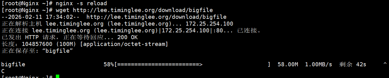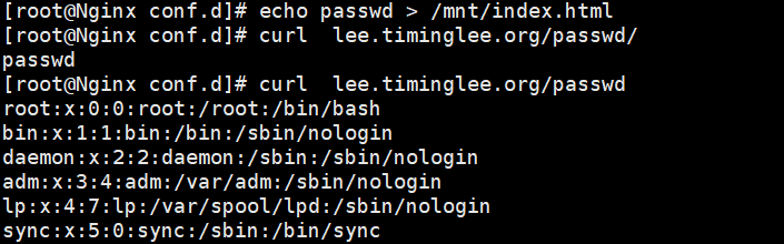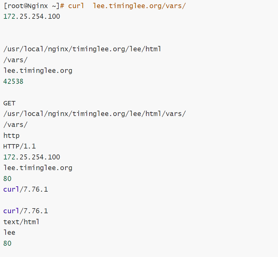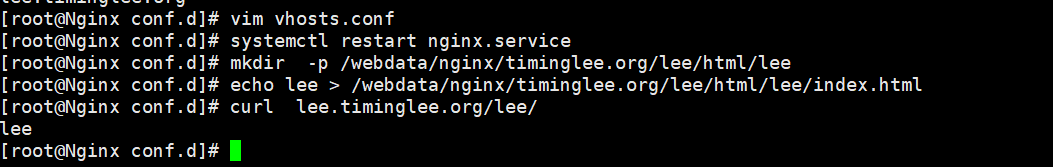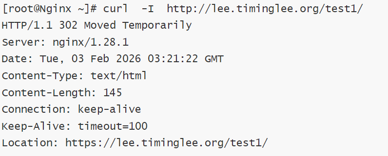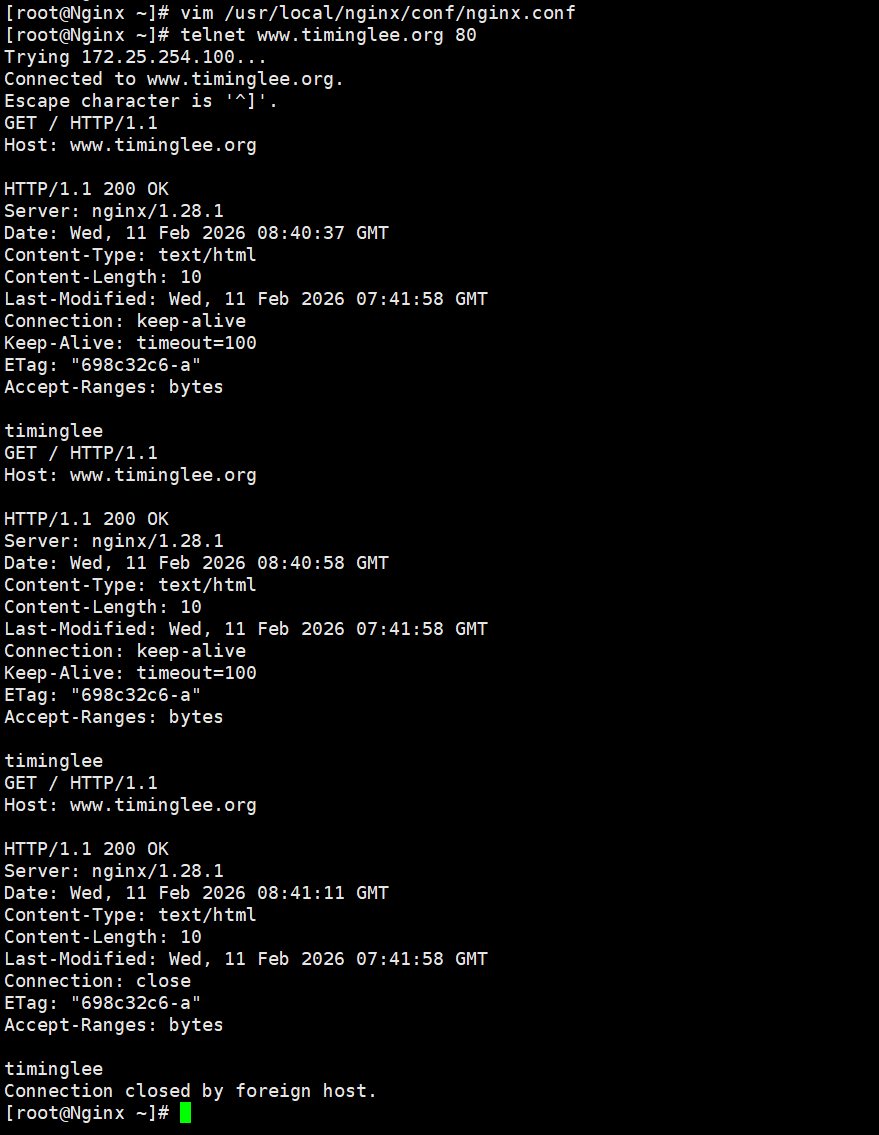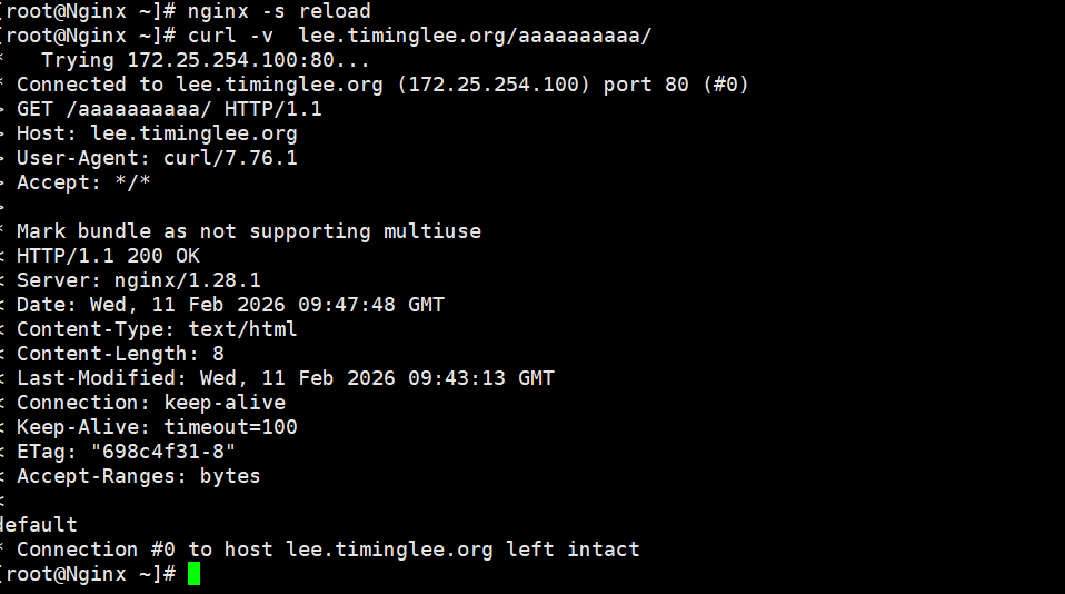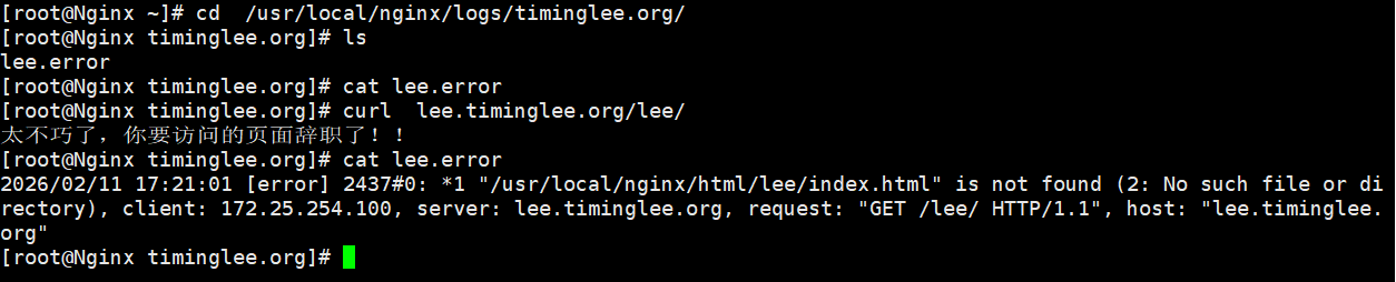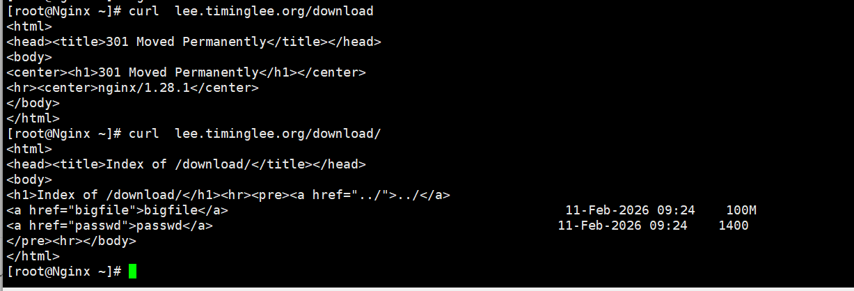 root@Nginx \~\]# systemctl daemon-reload #验证 \[root@Nginx \~\]# systemctl status nginx.service \[root@Nginx \~\]# systemctl enable --now nginx \[root@Nginx \~\]# ps aux \| grep nginx  \[root@Nginx \~\]# reboot \[root@Nginx \~\]# systemctl status nginx.service 5.Nginx的平滑升级及回滚 1.下载高版本的软件 \[root@Nginx \~\]# wget https://nginx.org/download/nginx-1.29.4.tar.gz #编译nginx隐藏版本 \[root@Nginx \~\]# tar zxf nginx-1.29.4.tar.gz \[root@Nginx \~\]# cd nginx-1.29.4/src/core/ \[root@Nginx core\]# vim nginx.h #define nginx_version 1029004 #define NGINX_VERSION "" #define NGINX_VER "TIMINGLEE/" NGINX_VERSION #文件编辑完成后进行源码编译即可 \[root@Nginx core\]# cd ../../ \[root@Nginx nginx-1.29.4\]# ./configure --prefix=/usr/local/nginx --user=nginx --group=nginx --with-http_ssl_module --with-http_v2_module --with-http_realip_module --with-http_stub_status_module --with-http_gzip_static_module --with-pcre --with-stream --with-stream_ssl_module --with-stream_realip_module \[root@Nginx nginx-1.29.4\]# make \[root@Nginx nginx-1.29.4\]# cd objs/ \[root@Nginx objs\]# ls autoconf.err nginx ngx_auto_config.h ngx_modules.c src Makefile nginx.8 ngx_auto_headers.h ngx_modules.o \[root@Nginx objs\]# cd /usr/local/nginx/sbin/ \[root@Nginx sbin\]# ls nginx \[root@Nginx sbin\]# \\cp -f /root/nginx-1.29.4/objs/nginx /usr/local/nginx/sbin/nginx \[root@Nginx sbin\]# ls /usr/local/nginx/logs/ access.log error.log nginx.pid \[root@Nginx sbin\]# ps aux \| grep nginx root 1643 0.0 0.1 14688 2360 ? Ss 09:55 0:00 nginx: master process /usr/local/nginx/sbin/nginx nginx 1644 0.0 0.2 14888 3896 ? S 09:55 0:00 nginx: worker process \[root@Nginx sbin\]# kill -USR2 1643 #nginx master进程id \[root@Nginx sbin\]# ps aux \| grep nginx root 1643 0.0 0.1 14688 2744 ? Ss 09:55 0:00 nginx: master process /usr/local/nginx/sbin/nginx nginx 1644 0.0 0.2 14888 3896 ? S 09:55 0:00 nginx: worker process root 4919 0.0 0.4 14716 7936 ? S 10:24 0:00 nginx: master process /usr/local/nginx/sbin/nginx nginx 4921 0.0 0.2 14916 4156 ? S 10:24 0:00 nginx: worker process root 4923 0.0 0.1 6636 2176 pts/0 S+ 10:25 0:00 grep --color=auto nginx \[root@Nginx sbin\]# ls /usr/local/nginx/logs/ access.log error.log nginx.pid nginx.pid.oldbin #测试效果 \[root@Nginx sbin\]# nginx -V #回收旧版本子进程 \[root@Nginx sbin\]# ps aux \| grep nginx \[root@Nginx sbin\]# kill -WINCH 1643 \[root@Nginx sbin\]# ps aux \| grep nginx 3.版本回退\|版本回滚 \[root@Nginx sbin\]# cd /usr/local/nginx/sbin/ \[root@Nginx sbin\]# cp nginx nginx.new -p \[root@Nginx sbin\]# \\cp nginx.old nginx -pf \[root@Nginx sbin\]# ps aux \| grep nginx root 1643 0.0 0.1 14688 2744 ? Ss 09:55 0:00 nginx: master process /usr/local/nginx/sbin/nginx root 4919 0.0 0.4 14716 7936 ? S 10:24 0:00 nginx: master process /usr/local/nginx/sbin/nginx nginx 4921 0.0 0.2 14916 4156 ? S 10:24 0:00 nginx: worker process \[root@Nginx sbin\]# kill -HUP 1643 \[root@Nginx sbin\]# ps aux \| grep nginx root 1643 0.0 0.1 14688 2744 ? Ss 09:55 0:00 nginx: master process /usr/local/nginx/sbin/nginx root 4919 0.0 0.4 14716 7936 ? S 10:24 0:00 nginx: master process /usr/local/nginx/sbin/nginx nginx 4921 0.0 0.2 14916 4156 ? S 10:24 0:00 nginx: worker process nginx 4963 0.0 0.2 14888 3896 ? S 10:32 0:00 nginx: worker process root 4965 0.0 0.1 6636 2176 pts/0 S+ 10:32 0:00 grep --color=auto nginx \[root@Nginx sbin\]# nginx -V #回收新版本进程 \[root@Nginx sbin\]# kill -WINCH 4919 \[root@Nginx sbin\]# ps aux \| grep nginx 6.Nginx配置文件的管理及优化参数 \[root@Nginx \~\]# vim /usr/local/nginx/conf/nginx.conf user nginx; \[root@Nginx \~\]# nginx -t nginx: the configuration file /usr/local/nginx/conf/nginx.conf syntax is ok nginx: configuration file /usr/local/nginx/conf/nginx.conf test is successful \[root@Nginx \~\]# nginx -s reload \[root@Nginx \~\]# ps aux \| grep nginx  \[root@Nginx \~\]# vim /usr/local/nginx/conf/nginx.conf worker_processes 2; \[root@Nginx \~\]# nginx -s reload \[root@Nginx \~\]# ps aux \| grep nginx #在vmware中更改硬件cpu核心个数,然后重启 \[root@Nginx \~\]# vim /usr/local/nginx/conf/nginx.conf worker_processes auto; worker_cpu_affinity 0001 0010 0100 1000; \[root@Nginx \~\]# ps aux \| grep nginx \[root@Nginx \~\]# ps axo pid,cmd,psr \| grep nginx  \[root@Nginx \~\]# vim /usr/local/nginx/conf/nginx.conf events { worker_connections 10000; use epoll; accept_mutex on; multi_accept on; } \[root@Nginx \~\]# nginx -s reload #测试并发 \[root@Nginx \~\]# dnf install httpd-tools -y \[root@Nginx \~\]# ab -n 100000 -c5000 http://172.25.254.100/index.html #处理本地文件系统的并发文件数量 \[root@Nginx \~\]# vim /etc/security/limits.conf \* - nofile 100000 \* - noproc 100000 root - nofile 100000 \[root@Nginx \~\]# sudo -u nginx ulimit -n 100000 \[root@Nginx \~\]# ulimit -n 10000 100000 #测试 \[root@Nginx \~\]# ab -n 100000 -c10000 http://172.25.254.100/index.html  7.Nginx下构建PC站点 1.location中的root \[root@Nginx conf\]# cd /usr/local/nginx/conf/ \[root@Nginx conf\]# mkdir conf.d \[root@Nginx conf\]# vim nginx.conf 82 include "/usr/local/nginx/conf/conf.d/\*.conf"; \[root@Nginx conf\]# nginx -s reload \[root@Nginx conf\]# cd conf.d/ \[root@Nginx \~\]# mkdir -p /webdata/nginx/timinglee.org/lee/html \[root@Nginx \~\]# echo lee.timinglee.org \> /webdata/nginx/timinglee.org/lee/html/index.html \[root@Nginx conf.d\]# vim vhosts.conf server { listen 80; server_name lee.timinglee.org; location / { root /webdata/nginx/timinglee.org/lee/html; } } root@Nginx conf.d\]# systemctl restart nginx.service #测试 \[root@Nginx conf.d\]# vim /etc/hosts 172.25.254.100 Nginx www.timinglee.org lee.timinglee.org  #local示例需要访问lee.timinglee.org/lee/目录 \[root@Nginx conf.d\]# vim vhosts.conf server { listen 80; server_name lee.timinglee.org; location / { root /webdata/nginx/timinglee.org/lee/html; } location /lee { #lee标识location中的root值+location 后面指定的值代表目录的路径 r