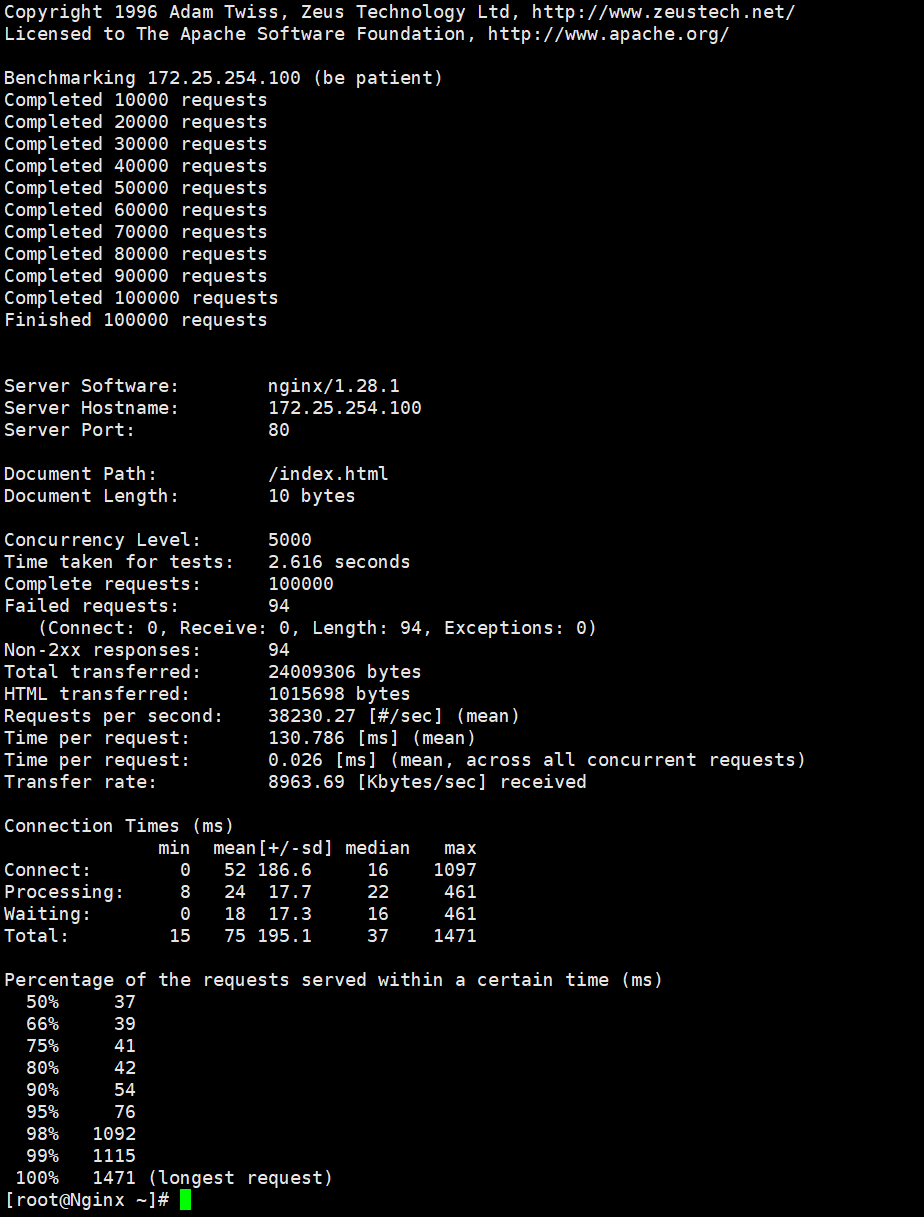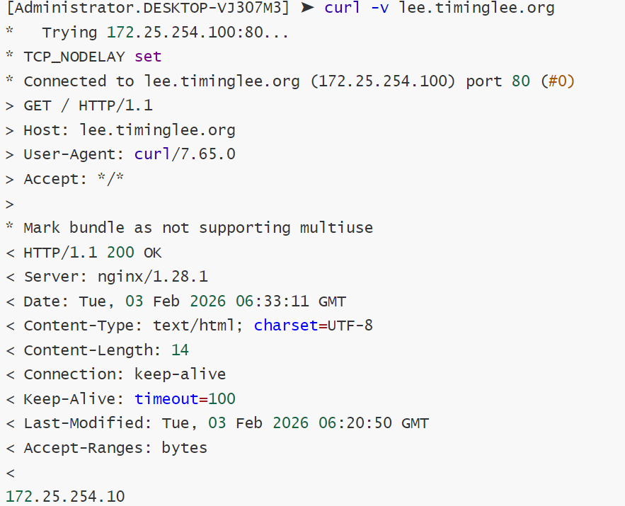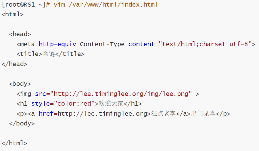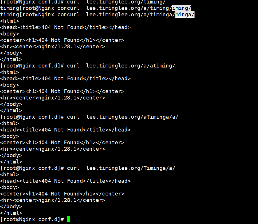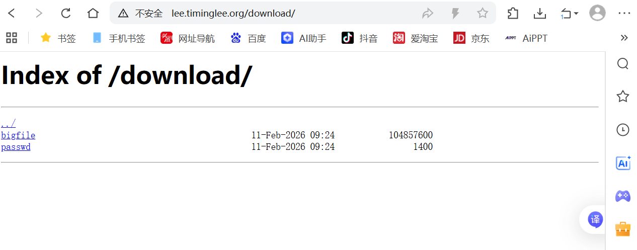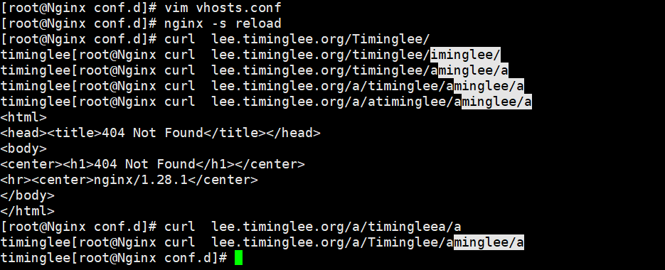 root@Nginx \~\]# systemctl daemon-reload #验证 \[root@Nginx \~\]# systemctl status nginx.service \[root@Nginx \~\]# systemctl enable --now nginx \[root@Nginx \~\]# ps aux \| grep nginx  \[root@Nginx \~\]# reboot \[root@Nginx \~\]# systemctl status nginx.service 5.Nginx的平滑升级及回滚 1.下载高版本的软件 \[root@Nginx \~\]# wget https://nginx.org/download/nginx-1.29.4.tar.gz #编译nginx隐藏版本 \[root@Nginx \~\]# tar zxf nginx-1.29.4.tar.gz \[root@Nginx \~\]# cd nginx-1.29.4/src/core/ \[root@Nginx core\]# vim nginx.h #define nginx_version 1029004 #define NGINX_VERSION "" #define NGINX_VER "TIMINGLEE/" NGINX_VERSION #文件编辑完成后进行源码编译即可 \[root@Nginx core\]# cd ../../ \[root@Nginx nginx-1.29.4\]# ./configure --prefix=/usr/local/nginx --user=nginx --group=nginx --with-http_ssl_module --with-http_v2_module --with-http_realip_module --with-http_stub_status_module --with-http_gzip_static_module --with-pcre --with-stream --with-stream_ssl_module --with-stream_realip_module \[root@Nginx nginx-1.29.4\]# make \[root@Nginx nginx-1.29.4\]# cd objs/ \[root@Nginx objs\]# ls autoconf.err nginx ngx_auto_config.h ngx_modules.c src Makefile nginx.8 ngx_auto_headers.h ngx_modules.o \[root@Nginx objs\]# cd /usr/local/nginx/sbin/ \[root@Nginx sbin\]# ls nginx \[root@Nginx sbin\]# \\cp -f /root/nginx-1.29.4/objs/nginx /usr/local/nginx/sbin/nginx \[root@Nginx sbin\]# ls /usr/local/nginx/logs/ access.log error.log nginx.pid \[root@Nginx sbin\]# ps aux \| grep nginx root 1643 0.0 0.1 14688 2360 ? Ss 09:55 0:00 nginx: master process /usr/local/nginx/sbin/nginx nginx 1644 0.0 0.2 14888 3896 ? S 09:55 0:00 nginx: worker process \[root@Nginx sbin\]# kill -USR2 1643 #nginx master进程id \[root@Nginx sbin\]# ps aux \| grep nginx root 1643 0.0 0.1 14688 2744 ? Ss 09:55 0:00 nginx: master process /usr/local/nginx/sbin/nginx nginx 1644 0.0 0.2 14888 3896 ? S 09:55 0:00 nginx: worker process root 4919 0.0 0.4 14716 7936 ? S 10:24 0:00 nginx: master process /usr/local/nginx/sbin/nginx nginx 4921 0.0 0.2 14916 4156 ? S 10:24 0:00 nginx: worker process root 4923 0.0 0.1 6636 2176 pts/0 S+ 10:25 0:00 grep --color=auto nginx \[root@Nginx sbin\]# ls /usr/local/nginx/logs/ access.log error.log nginx.pid nginx.pid.oldbin #测试效果 \[root@Nginx sbin\]# nginx -V #回收旧版本子进程 \[root@Nginx sbin\]# ps aux \| grep nginx \[root@Nginx sbin\]# kill -WINCH 1643 \[root@Nginx sbin\]# ps aux \| grep nginx 3.版本回退\|版本回滚 \[root@Nginx sbin\]# cd /usr/local/nginx/sbin/ \[root@Nginx sbin\]# cp nginx nginx.new -p \[root@Nginx sbin\]# \\cp nginx.old nginx -pf \[root@Nginx sbin\]# ps aux \| grep nginx root 1643 0.0 0.1 14688 2744 ? Ss 09:55 0:00 nginx: master process /usr/local/nginx/sbin/nginx root 4919 0.0 0.4 14716 7936 ? S 10:24 0:00 nginx: master process /usr/local/nginx/sbin/nginx nginx 4921 0.0 0.2 14916 4156 ? S 10:24 0:00 nginx: worker process \[root@Nginx sbin\]# kill -HUP 1643 \[root@Nginx sbin\]# ps aux \| grep nginx root 1643 0.0 0.1 14688 2744 ? Ss 09:55 0:00 nginx: master process /usr/local/nginx/sbin/nginx root 4919 0.0 0.4 14716 7936 ? S 10:24 0:00 nginx: master process /usr/local/nginx/sbin/nginx nginx 4921 0.0 0.2 14916 4156 ? S 10:24 0:00 nginx: worker process nginx 4963 0.0 0.2 14888 3896 ? S 10:32 0:00 nginx: worker process root 4965 0.0 0.1 6636 2176 pts/0 S+ 10:32 0:00 grep --color=auto nginx \[root@Nginx sbin\]# nginx -V #回收新版本进程 \[root@Nginx sbin\]# kill -WINCH 4919 \[root@Nginx sbin\]# ps aux \| grep nginx 6.Nginx配置文件的管理及优化参数 \[root@Nginx \~\]# vim /usr/local/nginx/conf/nginx.conf user nginx; \[root@Nginx \~\]# nginx -t nginx: the configuration file /usr/local/nginx/conf/nginx.conf syntax is ok nginx: configuration file /usr/local/nginx/conf/nginx.conf test is successful \[root@Nginx \~\]# nginx -s reload \[root@Nginx \~\]# ps aux \| grep nginx  \[root@Nginx \~\]# vim /usr/local/nginx/conf/nginx.conf worker_processes 2; \[root@Nginx \~\]# nginx -s reload \[root@Nginx \~\]# ps aux \| grep nginx #在vmware中更改硬件cpu核心个数,然后重启 \[root@Nginx \~\]# vim /usr/local/nginx/conf/nginx.conf worker_processes auto; worker_cpu_affinity 0001 0010 0100 1000; \[root@Nginx \~\]# ps aux \| grep nginx \[root@Nginx \~\]# ps axo pid,cmd,psr \| grep nginx  \[root@Nginx \~\]# vim /usr/local/nginx/conf/nginx.conf events { worker_connections 10000; use epoll; accept_mutex on; multi_accept on; } \[root@Nginx \~\]# nginx -s reload #测试并发 \[root@Nginx \~\]# dnf install httpd-tools -y \[root@Nginx \~\]# ab -n 100000 -c5000 http://172.25.254.100/index.html #处理本地文件系统的并发文件数量 \[root@Nginx \~\]# vim /etc/security/limits.conf \* - nofile 100000 \* - noproc 100000 root - nofile 100000 \[root@Nginx \~\]# sudo -u nginx ulimit -n 100000 \[root@Nginx \~\]# ulimit -n 10000 100000 #测试 \[root@Nginx \~\]# ab -n 100000 -c10000 http://172.25.254.100/index.html  7.Nginx下构建PC站点 1.location中的root \[root@Nginx conf\]# cd /usr/local/nginx/conf/ \[root@Nginx conf\]# mkdir conf.d \[root@Nginx conf\]# vim nginx.conf 82 include "/usr/local/nginx/conf/conf.d/\*.conf"; \[root@Nginx conf\]# nginx -s reload \[root@Nginx conf\]# cd conf.d/ \[root@Nginx \~\]# mkdir -p /webdata/nginx/timinglee.org/lee/html \[root@Nginx \~\]# echo lee.timinglee.org \> /webdata/nginx/timinglee.org/lee/html/index.html \[root@Nginx conf.d\]# vim vhosts.conf server { listen 80; server_name lee.timinglee.org; location / { root /webdata/nginx/timinglee.org/lee/html; } } root@Nginx conf.d\]# systemctl restart nginx.service #测试 \[root@Nginx conf.d\]# vim /etc/hosts 172.25.254.100 Nginx www.timinglee.org lee.timinglee.org  #local示例需要访问lee.timinglee.org/lee/目录 \[root@Nginx conf.d\]# vim vhosts.conf server { listen 80; server_name lee.timinglee.org; location / { root /webdata/nginx/timinglee.org/lee/html; } location /lee { #lee标识location中的root值+location 后面指定的值代表目录的路径 r