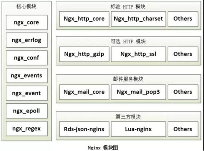 第三方模块:是为了扩展 Nginx 服务器应用,完成开发者自定义功能,比如: Json 支持、 Lua 支持等