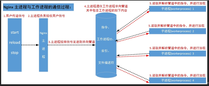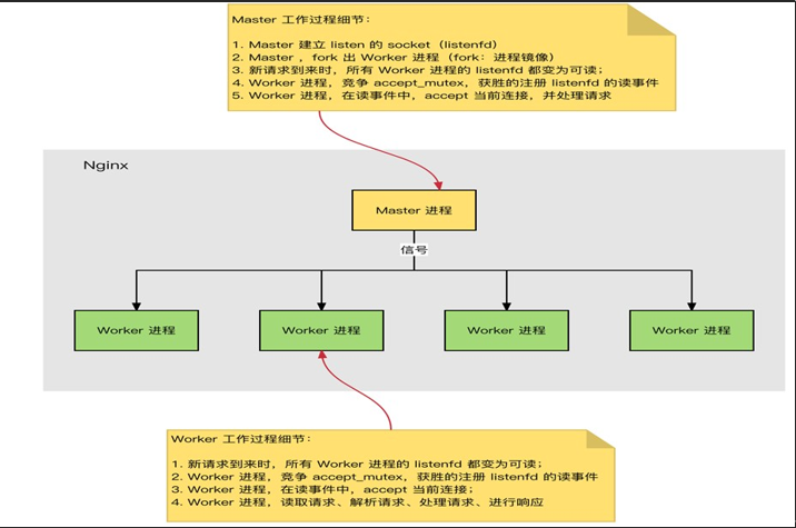 主进程与外界通过信号机制进行通信,当接收到需要处理的信号时,它通过管道向相关的工作进程发送正确的指令,每个工作进程都有能力捕获管道中的可读事件,当管道中有可读事件的时候,工作进程就会从管道中读取并解析指令,然后采取相应的执行动作,这样就完成了主进程与工作进程的交互。