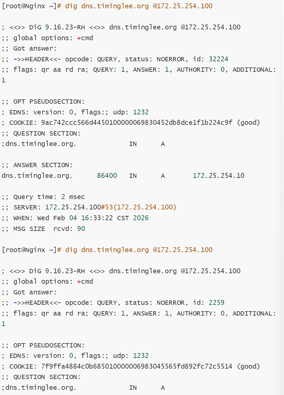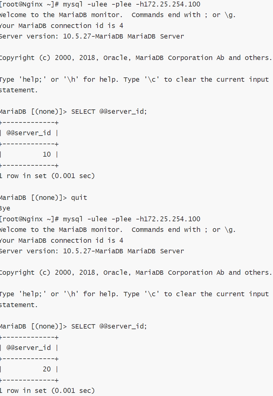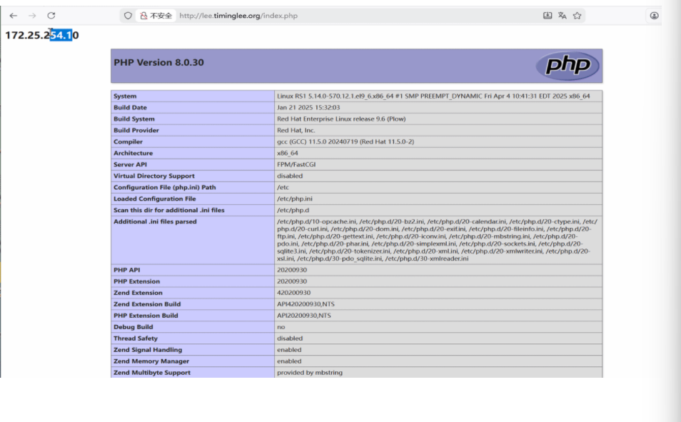 root@Nginx etc\]# cd php-fpm.d/ \[root@Nginx php-fpm.d\]# cp www.conf.default www.conf \[root@Nginx php-fpm.d\]# vim www.conf 41 listen = 0.0.0.0:9000 \[root@Nginx php-fpm.d\]# cp /root/php-8.3.30/php.ini-production /usr/local/php/etc/php.ini \[root@Nginx php-fpm.d\]# vim /usr/local/php/etc/php.ini 989 date.timezone = Asia/Shangha \[root@Nginx \~\]# cp /root/php-8.3.30/sapi/fpm/php-fpm.service /lib/systemd/system/ \[root@Nginx \~\]# vim /lib/systemd/system/php-fpm.service # Mounts the /usr, /boot, and /etc directories read-only for processes invoked by this unit. #ProtectSystem=full #注释此参数 \[root@Nginx \~\]# systemctl daemon-reload \[root@Nginx \~\]# systemctl enable --now php-fpm \[root@Nginx \~\]# netstat -antlupe \| grep php tcp 0 0 0.0.0.0:9000 0.0.0.0:\* LISTEN 0 329917 165562/php-fpm: mas 5.为php设定环境变量 \[root@Nginx \~\]# vim \~/.bash_profile export PATH=$PATH:/usr/local/nginx/sbin:/usr/local/php/sbin:/usr/local/php/bin \[root@Nginx \~\]# source \~/.bash_profile \[root@Nginx \~\]# php -m 28.Nginx整合PHP \[root@Nginx conf.d\]# mkdir /webdir/timinglee.org/php/html -p \[root@Nginx conf.d\]# vim /webdir/timinglee.org/php/html/index.html php.timinglee.org \[root@Nginx conf.d\]# vim /webdir/timinglee.org/php/html/index.php \ \[root@Nginx \~\]# cd /usr/local/nginx/conf/conf.d/ \[root@Nginx conf.d\]# vim php.conf server { listen 80; server_name php.timinglee.org; root /webdir/timinglee.org/php/html; location \~ \\.php$ { fastcgi_pass 127.0.0.1:9000; fastcgi_index index.php; include fastcgi.conf; } } \[root@Nginx conf.d\]# nginx -s reload #测试 http://php.timinglee.org http://php.timinglee.org/index.php 29.nginx+memcache实现高速缓存解 1.重新编译nginx \[root@Nginx \~\]# systemctl stop nginx.service \[root@Nginx \~\]# cp /usr/local/nginx/conf/ /mnt/ -r \[root@Nginx \~\]# rm -fr /usr/local/nginx/ \[root@Nginx \~\]# rm -rf nginx-1.29.4 nginx-1.28.1 \[root@Nginx \~\]# tar zxf nginx-1.28.1.tar.gz \[root@Nginx \~\]# cd nginx-1.28.1/ \[root@Nginx \~\]# tar zxf srcache-nginx-module-0.33.tar.gz \[root@Nginx \~\]# tar zxf memc-nginx-module-0.20.tar.gz \[root@Nginx \~\]# cd nginx-1.28.1/ \[root@Nginx nginx-1.28.1\]# ./configure --prefix=/usr/local/nginx --user=nginx --group=nginx --with-http_ssl_module --with-http_v2_module --with-http_realip_module --with-http_stub_status_module --with-http_gzip_static_module --with-pcre --with-stream --with-stream_ssl_module --with-stream_realip_module --add-module=/root/echo-nginx-module-0.64 --add-module=/root/memc-nginx-module-0.20 --add-module=/root/srcache-nginx-module-0.33 \[root@Nginx nginx-1.28.1\]# make \&\& make install \[root@Nginx \~\]# cd /usr/local/nginx/conf \[root@Nginx conf\]# rm -fr nginx.conf \[root@Nginx conf\]# cp /mnt/conf/nginx.conf /mnt/conf/conf.d/ . -r \[root@Nginx conf\]# systemctl start nginx.service 2.整合memcache \[root@Nginx conf\]# vim /usr/local/nginx/conf/conf.d/php.conf upstream memcache { server 127.0.0.1:11211; keepalive 512; } server { listen 80; server_name php.timinglee.org; root /webdir/timinglee.org/php/html; index index.php index.html; location /memc { internal; memc_connect_timeout 100ms; memc_send_timeout 100ms; memc_read_timeout 100ms; set $memc_key $query_string; set $memc_exptime 300; memc_pass memcache; } location \~ \\.php$ { set $key $uri$args; srcache_fetch GET /memc $key; srcache_store PUT /memc $key; fastcgi_pass 127.0.0.1:9000; fastcgi_index index.php; include fastcgi.conf; } } \[root@Nginx conf\]# nginx -s reload  29.Nginx的四层负载均衡代理 1.实验环境(Mysql) \[root@RS1 \~\]# dnf install mariadb-server -y \[root@RS2 \~\]# dnf install mariadb-server -y \[root@RS1 \~\]# vim /etc/my.cnf.d/mariadb-server.cnf server-id=10 \[root@RS2 \~\]# vim /etc/my.cnf.d/mariadb-server.cnf server-id=20 \[root@RS1 \~\]# systemctl enable --now mariadb \[root@RS2 \~\]# systemctl enable --now mariadb \[root@RS1 \~\]# mysql  2.实验环境(dns) \[root@RS1 \~\]# dnf install bind -y \[root@RS2 \~\]# dnf install bind -y \[root@RS1 \~\]# vim /etc/named.conf \[root@RS2 \~\]# vim /etc/named.conf options { // listen-on port 53 { 127.0.0.1; }; // listen-on-v6 port 53 { ::1; }; directory "/var/named"; dump-file "/var/named/data/cache_dump.db"; statistics-file "/var/named/data/named_stats.txt"; memstatistics-file "/var/named/data/named_mem_stats.txt"; secroots-file "/var/named/data/named.secroots"; recursing-file "/var/named/data/named.recursing"; // allow-query { localhost; }; dnssec-validation no; \[root@RS1 \~\]# vim /etc/named.rfc1912.zones \[root@RS2 \~\]# vim /etc/named.rfc1912.zones zone "timinglee.org" IN { type master; file "timinglee.org.zone"; allow-update { none; }; }; \[root@RS1 \~\]# cd /var/named/ \[root@RS2 \~\]# cd /var/named/ \[root@RS1 named\]# cp -p named.localhost timinglee.org.zone \[root@RS2 named\]# cp -p named.localhost timinglee.org.zone \[root@RS1 named\]# vim timinglee.org.zone $TTL 1D @ IN SOA dns.timingle.org. rname.invalid. ( 0 ; serial 1D ; refresh 1H ; retry 1W ; expire 3H ) ; minimum NS dns.timinglee.org. dns A 172.25.254.10 \[root@RS2 named\]# vim timinglee.org.zone $TTL 1D @ IN SOA dns.timingle.org. rname.invalid. ( 0 ; serial 1D ; refresh 1H ; retry 1W ; expire 3H ) ; minimum NS dns.timinglee.org. dns A 172.25.254.20 \[root@RS2 named\]# systemctl enable --now named #测试  3.tcp四层负载 \[root@Nginx conf\]# mkdir /usr/local/nginx/conf/tcp -p \[root@Nginx conf\]# mkdir /usr/local/nginx/conf/udp -p \[root@Nginx conf\]# vim /usr/local/nginx/conf/nginx.conf include "/usr/local/nginx/conf/tcp/\*.conf"; \[root@Nginx conf\]# vim /usr/local/nginx/conf/tcp/mariadb.conf stream { upstream mysql_server { server 172.25.254.10:3306 max_fails=3 fail_timeout=30s; server 172.25.254.20:3306 max_fails=3 fail_timeout=30s; } server { listen 172.25.254.100:3306; proxy_pass mysql_server; proxy_connect_timeout 30s; proxy_timeout 300s; } } \[root@Nginx conf\]# nginx -s reload #检测 \[root@Nginx \~\]# mysql -ulee -plee -h172.25.254.100  4.udp四层负载 \[root@Nginx \~\]# vim /