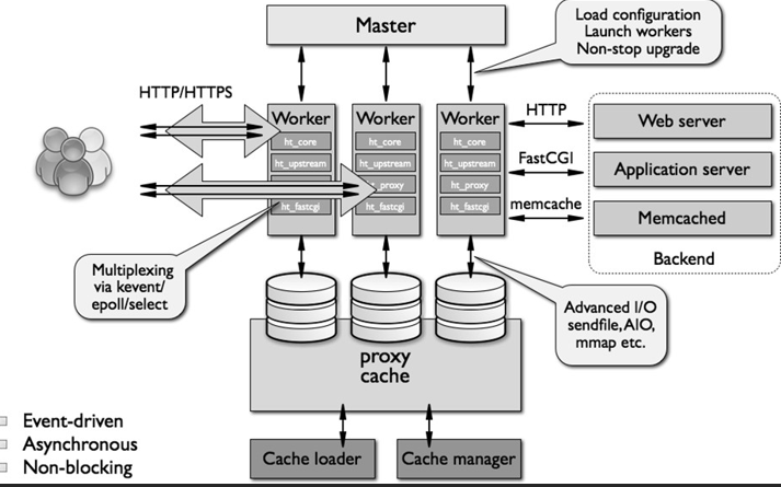 模块化设计,较好的扩展性高可靠性 支持热部署:不停机更新配置文件,升级版本,更换日志文件 低内存消耗:10000个keep-alive连接模式下的非活动连接,仅需2.5M内存 event-driven,aio,mmap,sendfile
