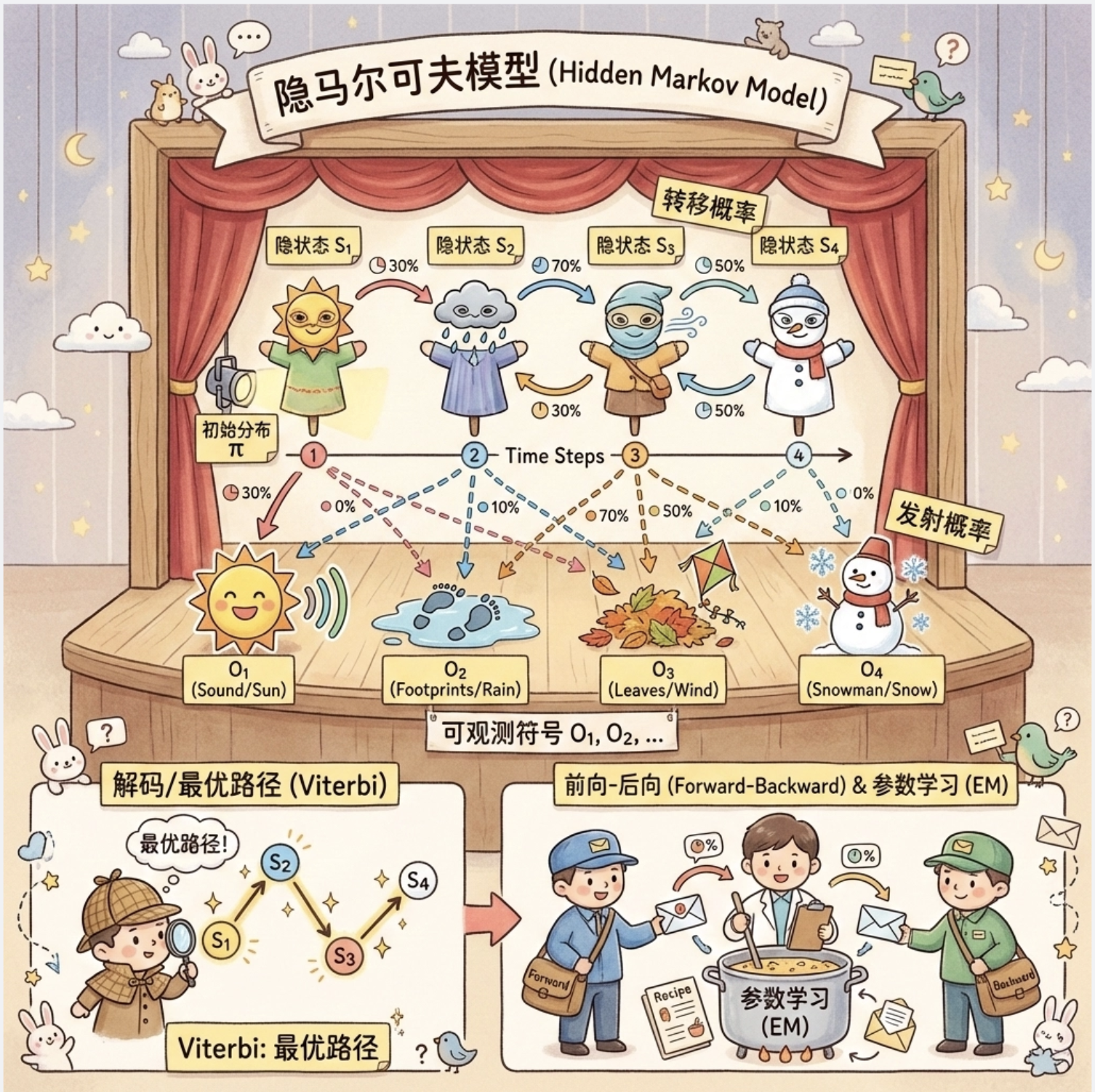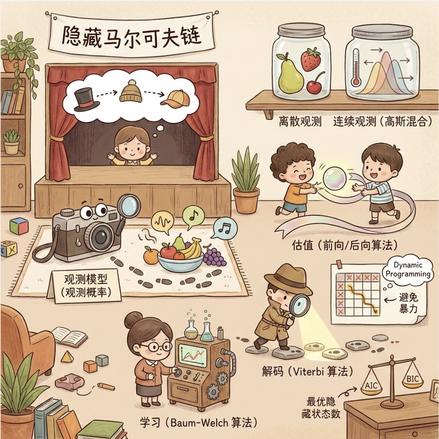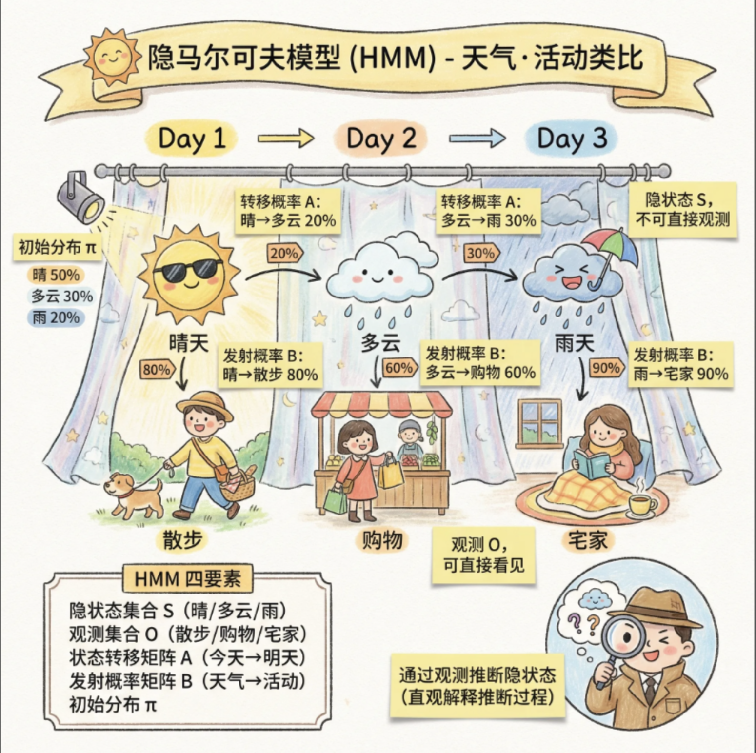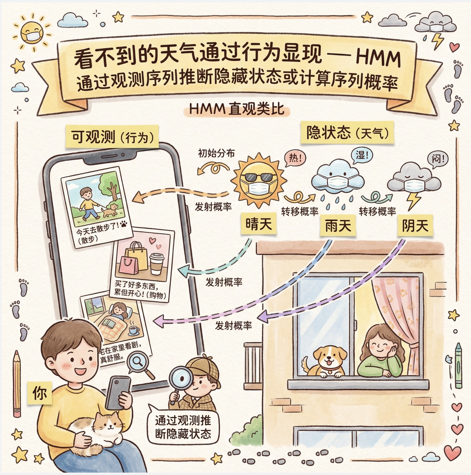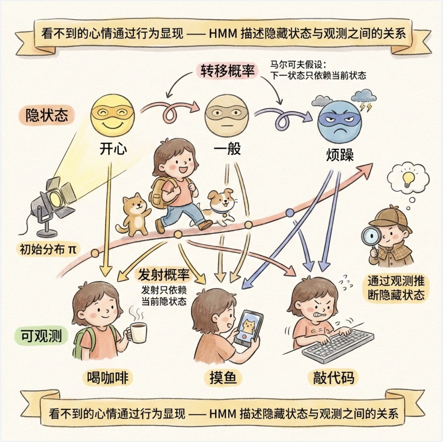 想象一下:你每天上班的状态(开心、一般、烦躁)是 "隐藏" 的,别人看不到,但能通过你的行为(喝咖啡、摸鱼、敲代码)"观察" 到。隐马尔可夫模型(HMM)就是描述这种 "隐藏状态" 和 "可观测行为" 之间关系的模型。