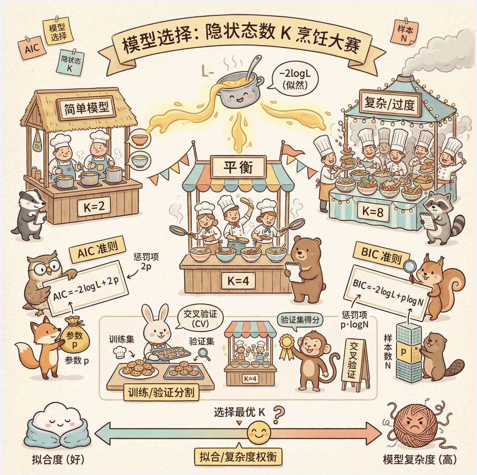 模型选择的核心是 "选择最优的隐藏状态数 K",常用方法: