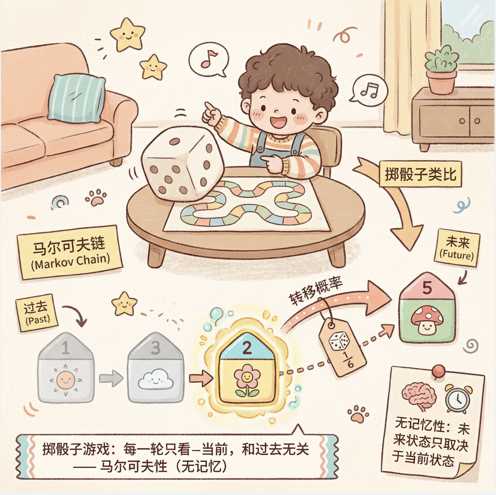 你玩掷骰子游戏,每一轮的点数(状态)只和当前轮次有关,和上一轮掷出几点没关系 ------ 这就是最简单的马尔可夫性。