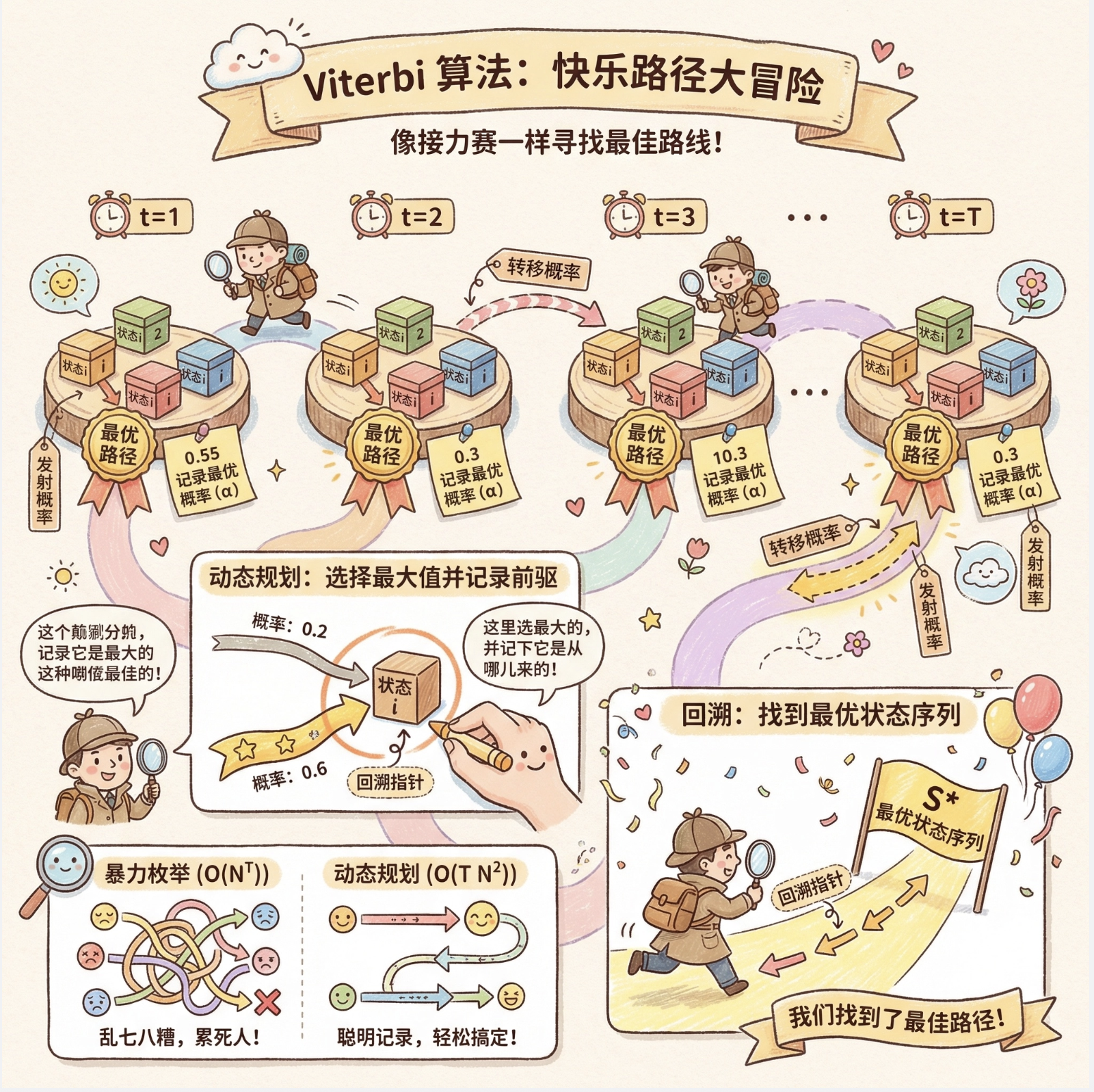 2.核心算法 :前向 / 后向算法(估值)、Viterbi 算法(解码)、Baum-Welch 算法(参数学习),均基于动态规划思想,避免暴力枚举的高复杂度。