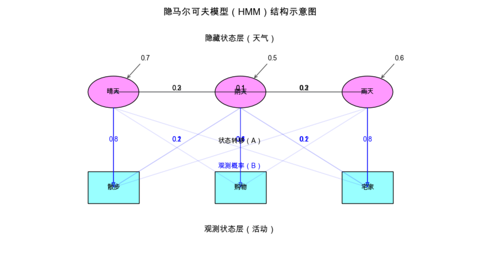 # 初始状态概率:初始是晴天(60%)、阴天(30%)、雨天(10%)