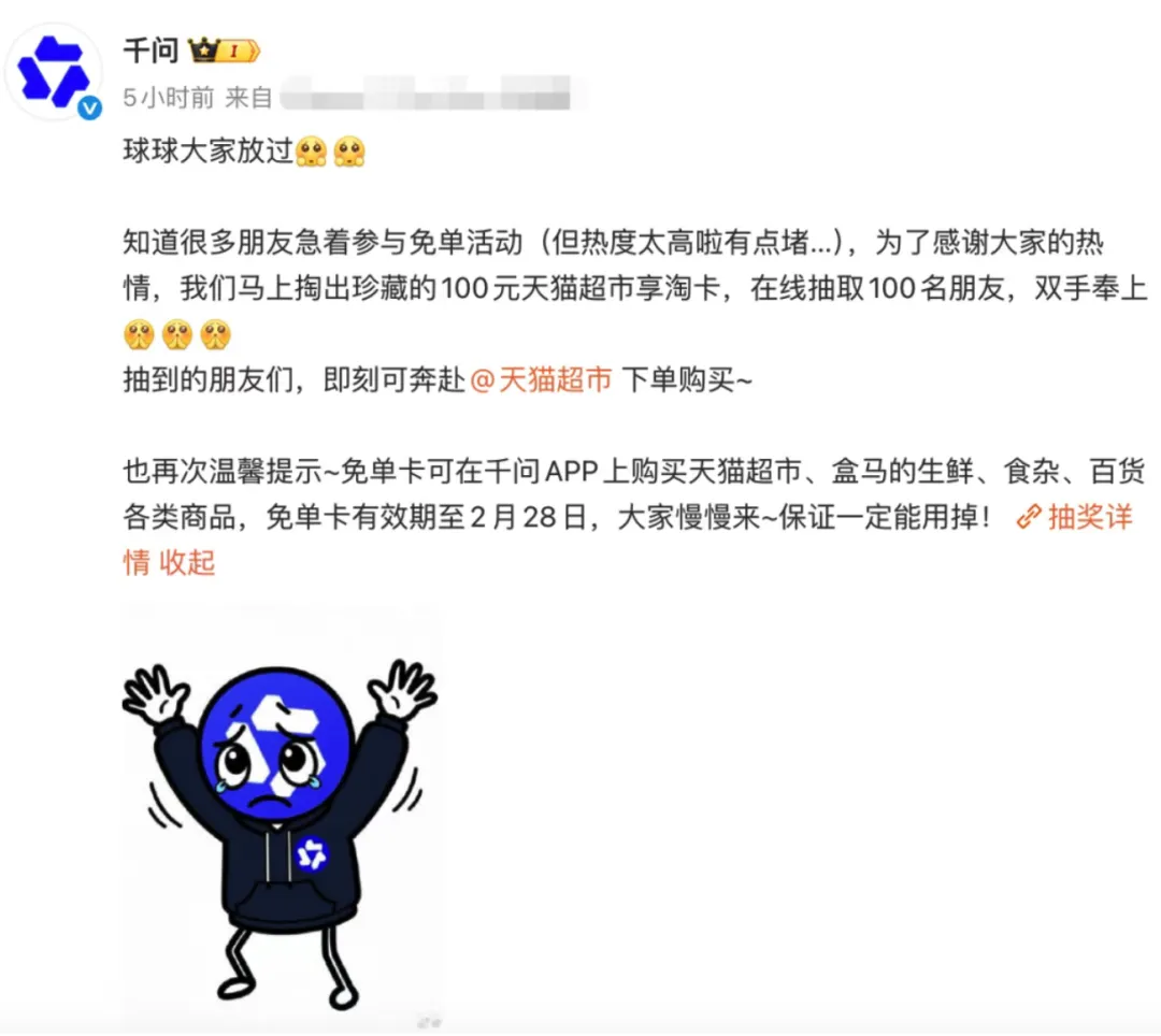 但之后千问APP崩,奶茶店也有很多爆单了,官方直接在网上发言求放过。