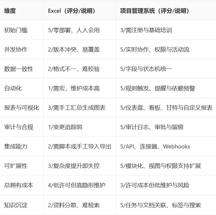 下面的对比表用于评估 Excel 与项目管理系统在关键维度上的差异,评分为 1-5(5 为强),并结合定性说明以便形成直观判断。
