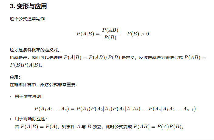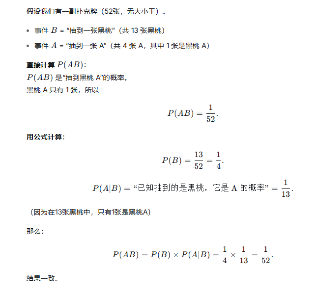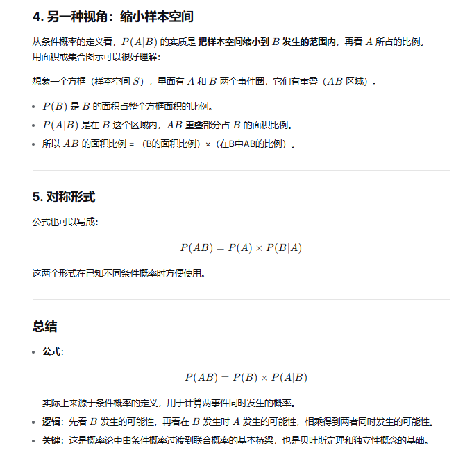 通俗的理解:P(AB)=P(A)×P(B∣A) 是A占总样本面积比例x AB重叠部分占A的面积的比例,结果就是AB重叠部分占总样本面积比例。