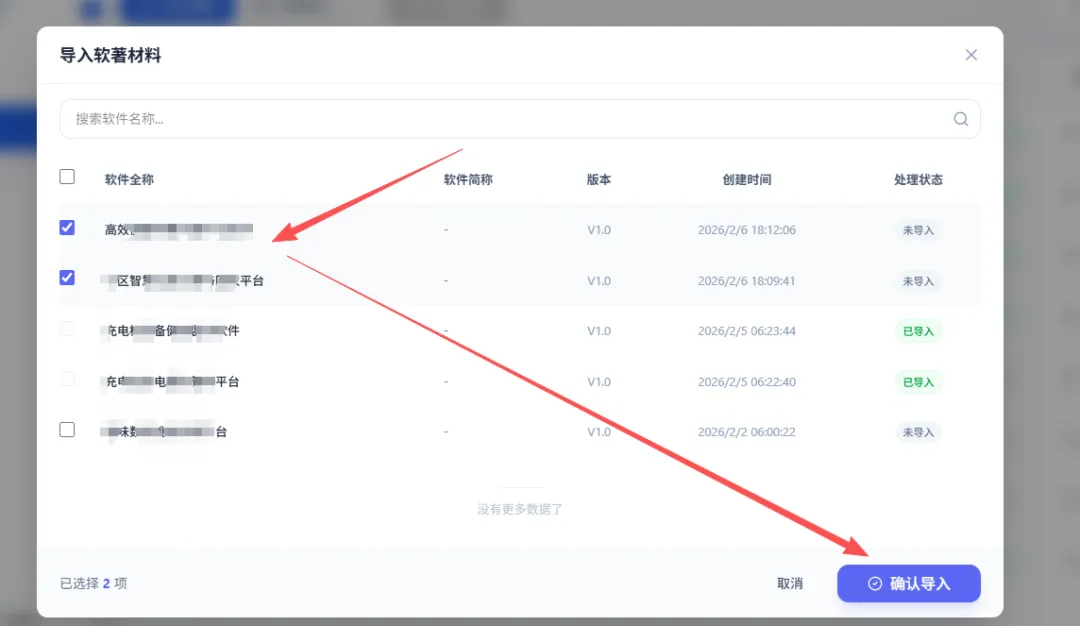 点击自动提交界面的 导入材料 按钮,打开导入弹窗。