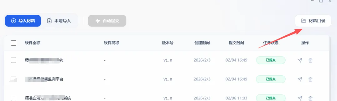 工具自动导入软著到本地,点击材料目录可以看到存储在本地目录的软著申请材料。