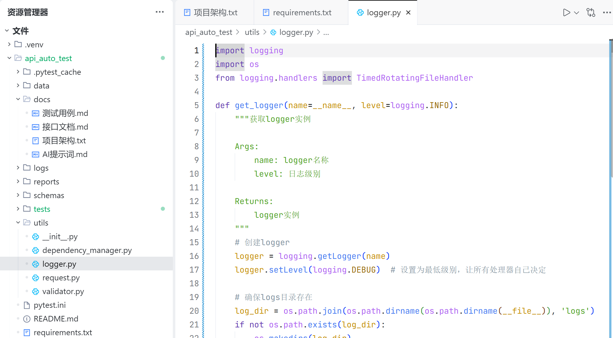 logger.py 用于存放打印日志的工具类;