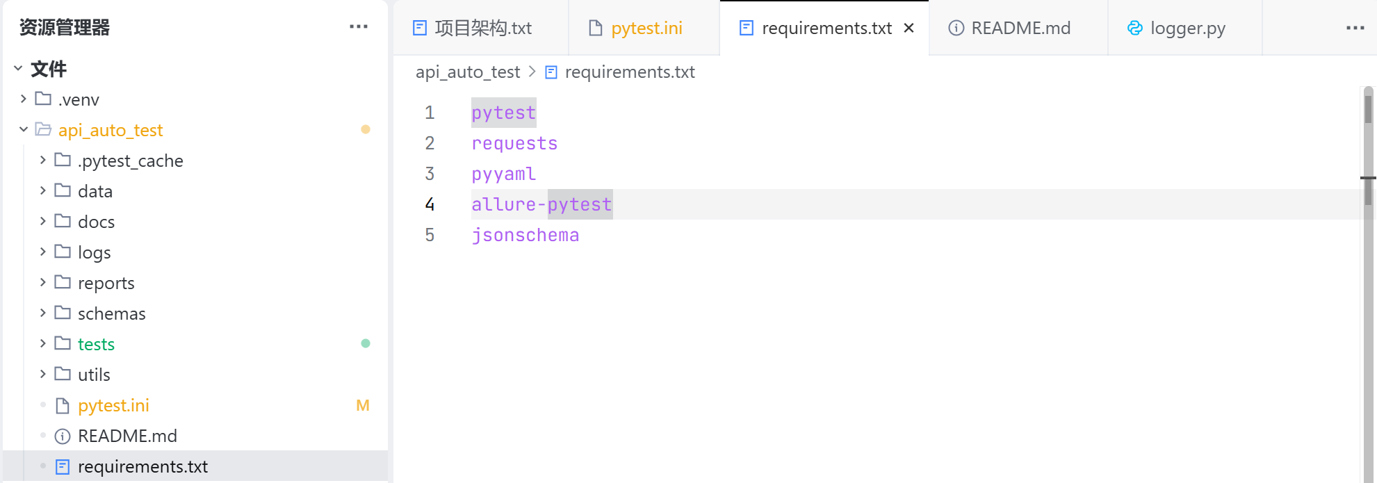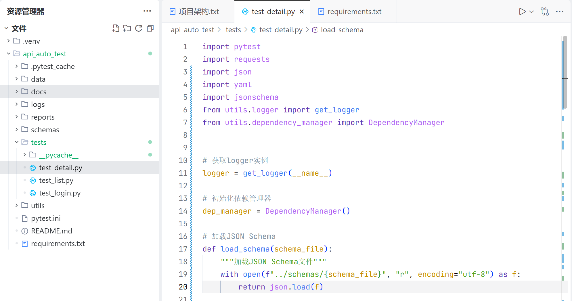 注意, 检查以下技术栈是否都在项目中使用: Python, pytest, requests, YAML, Allure, jsonschema, logging;