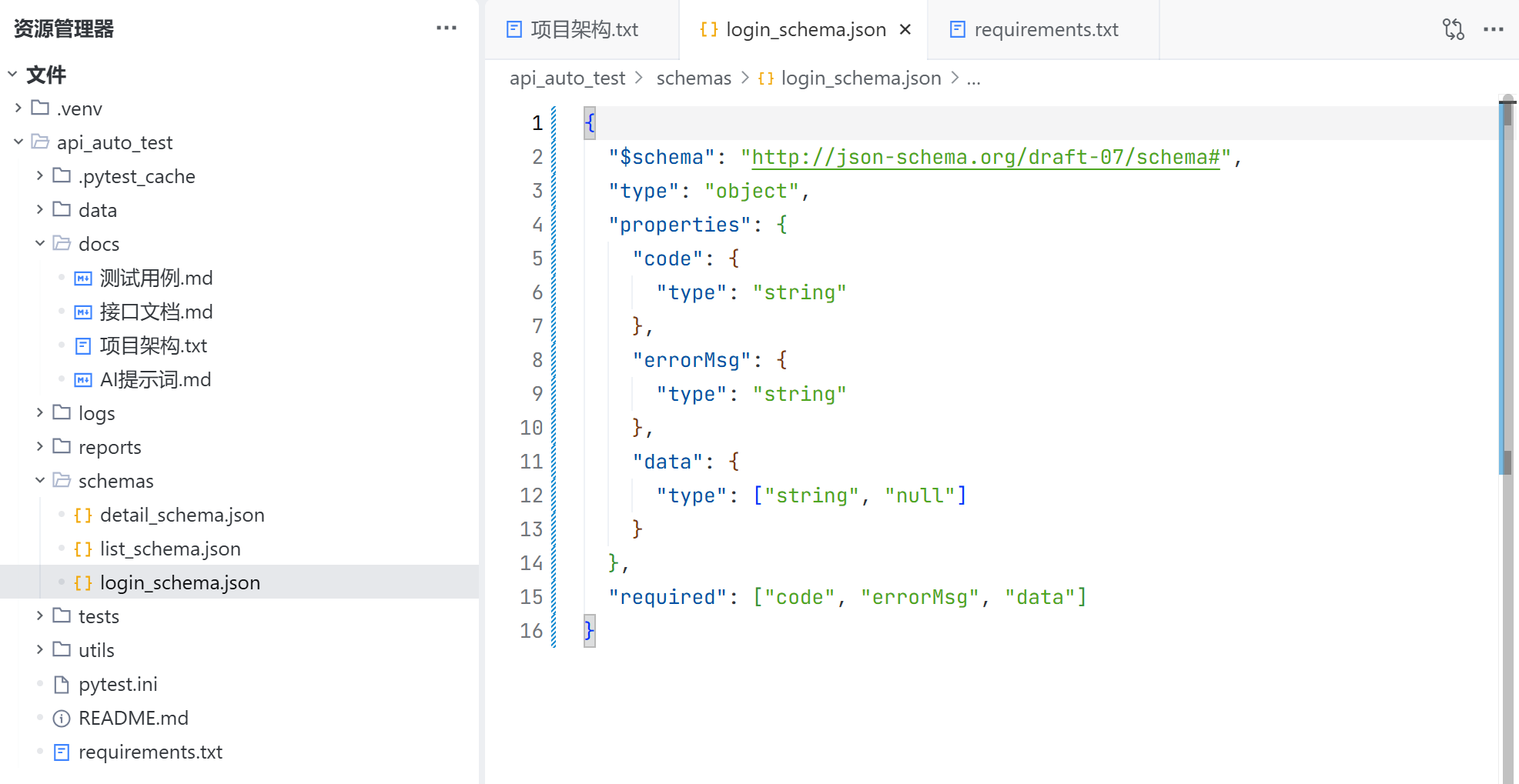login_schema.json 用于校验登录接口返回的字段是否齐全,以及每一个字段的额类型是否正确;