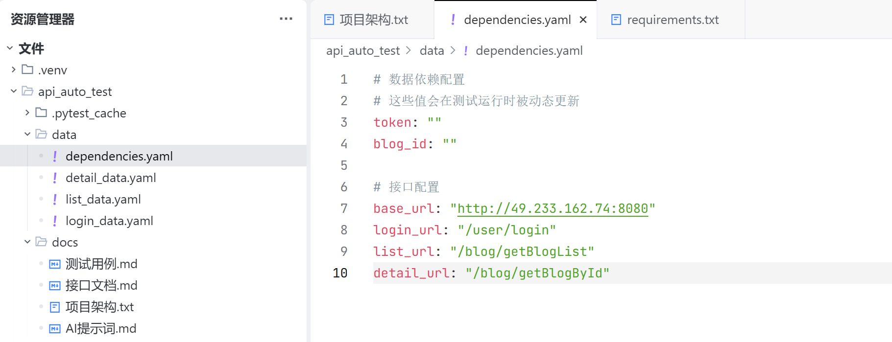 dependencies.yaml 用于保存各个接口的配置,以及登录成功后的登录凭证,访问接口列表后获取的有效的 blogId;