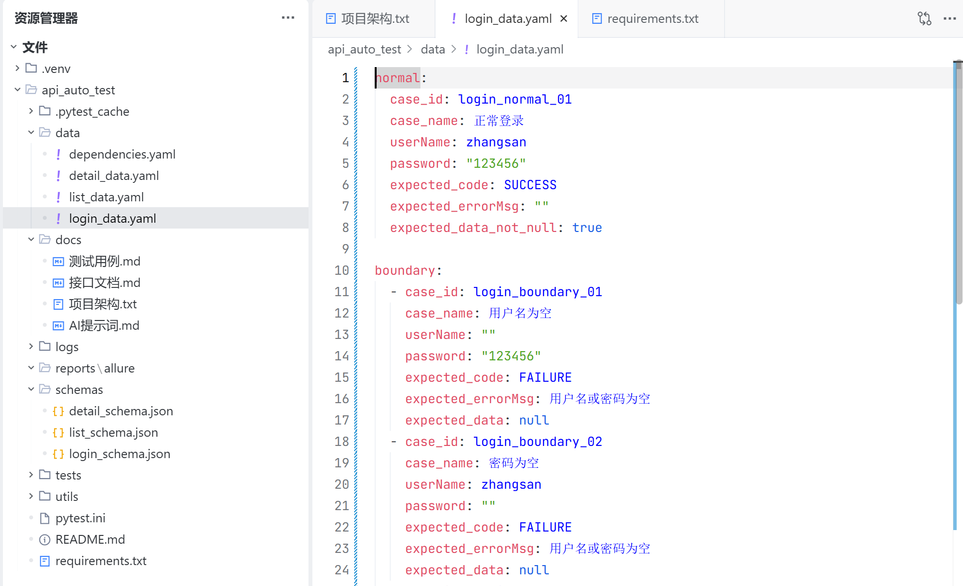 login_data.yaml 用于保存登录接口所有测试用例预期返回的结果,用于校验接口的返回值是否正确;