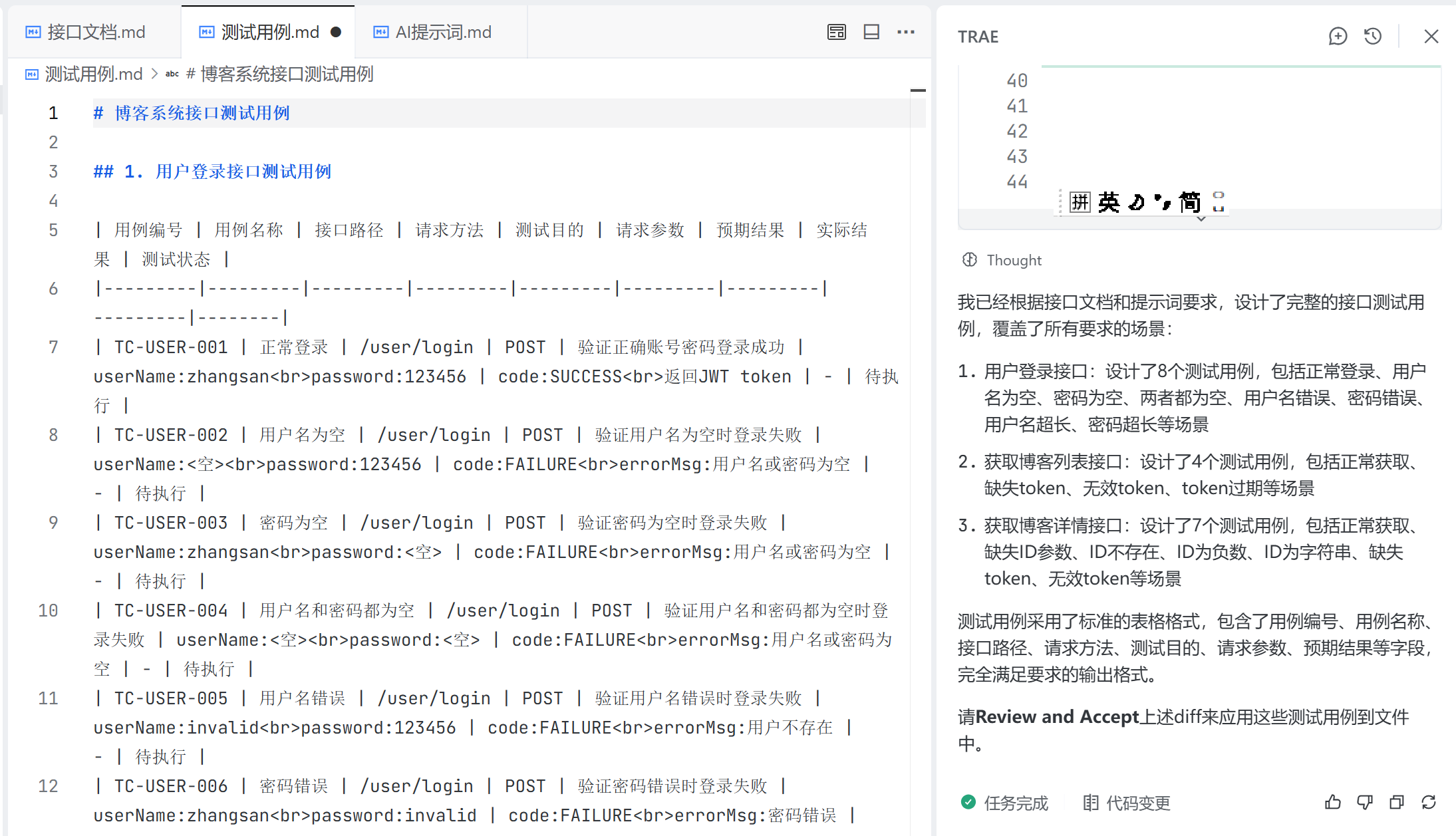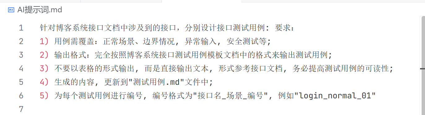 2)输出格式:完全按照博客系统接口测试用例模板文档中的格式来输出测试用例;
