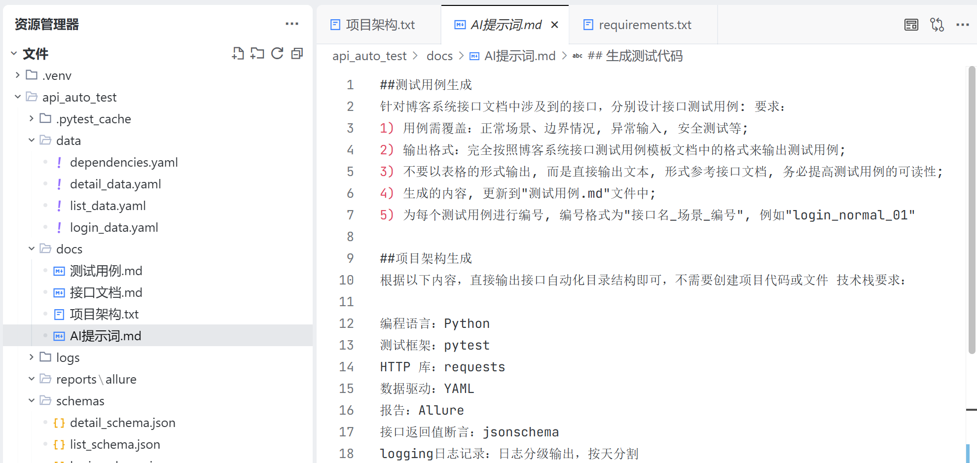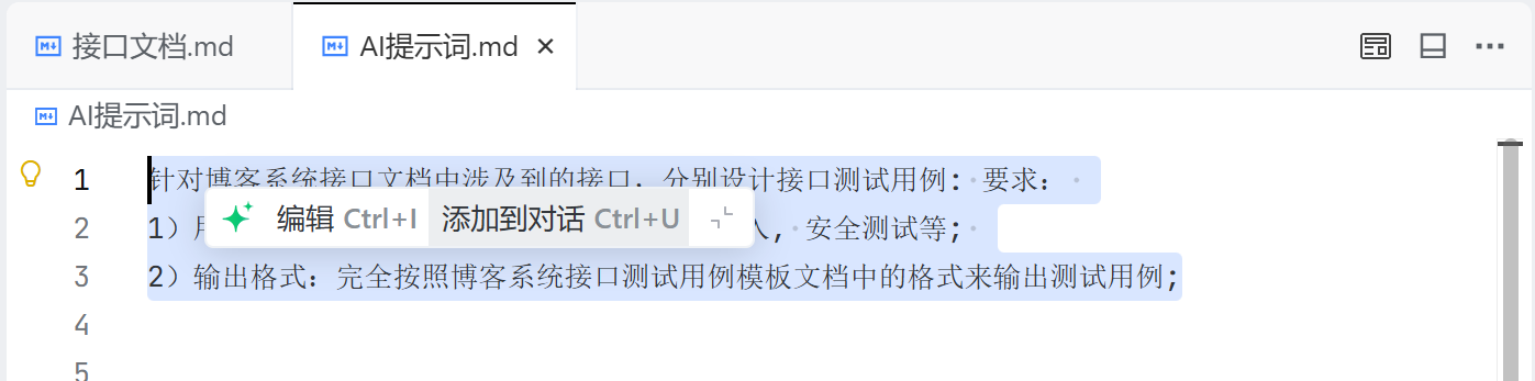 2)项目开始阶段,工程师往往不能一次性考虑得特别全面,因此给出的 AI 提示词往往也不够完善,因此我们可以在工程中创建一个 AI 提示词的文档,当发现 AI 提示词不完善时,可以随时进行补充,以便于后续让 AI 给出更合理的回复;