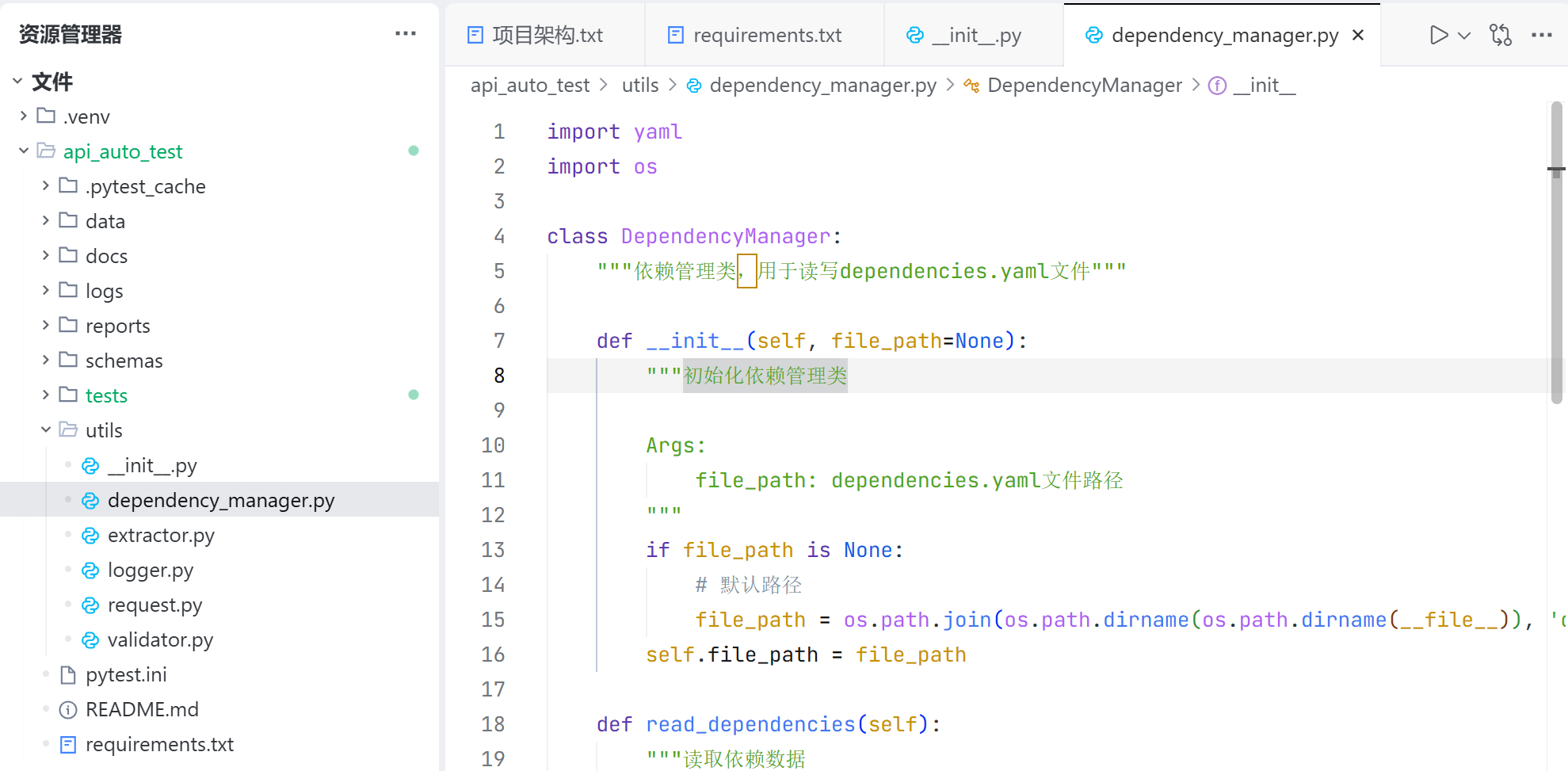 dependency_manager.py 用于存放项目所依赖的数据的工具类,这个工具类用于获取接口的 url,保存/获取登录凭证,保存/获取有效的 blogId 等;