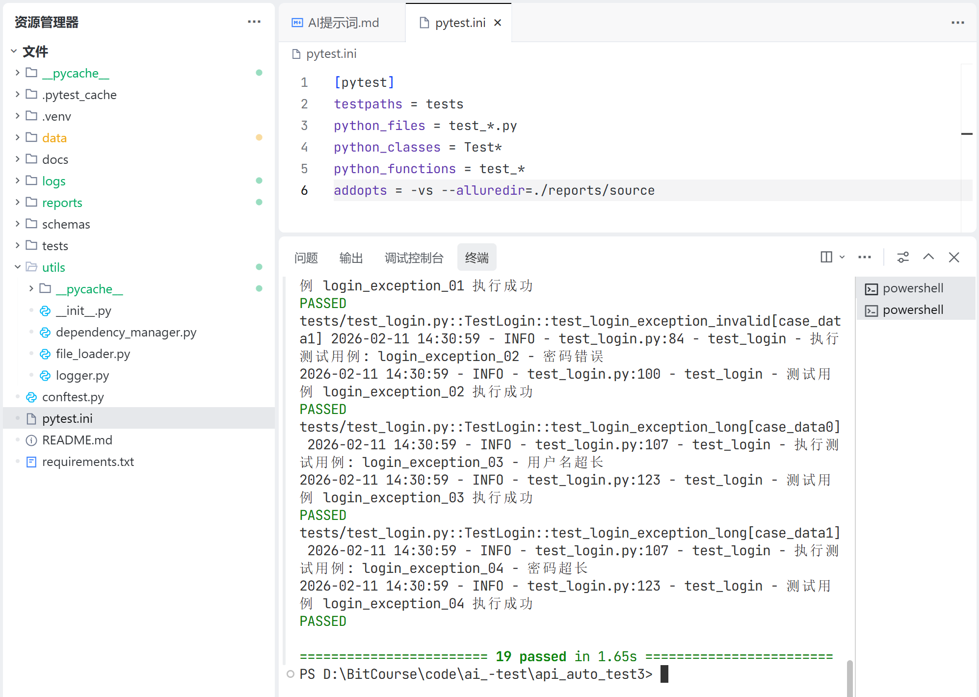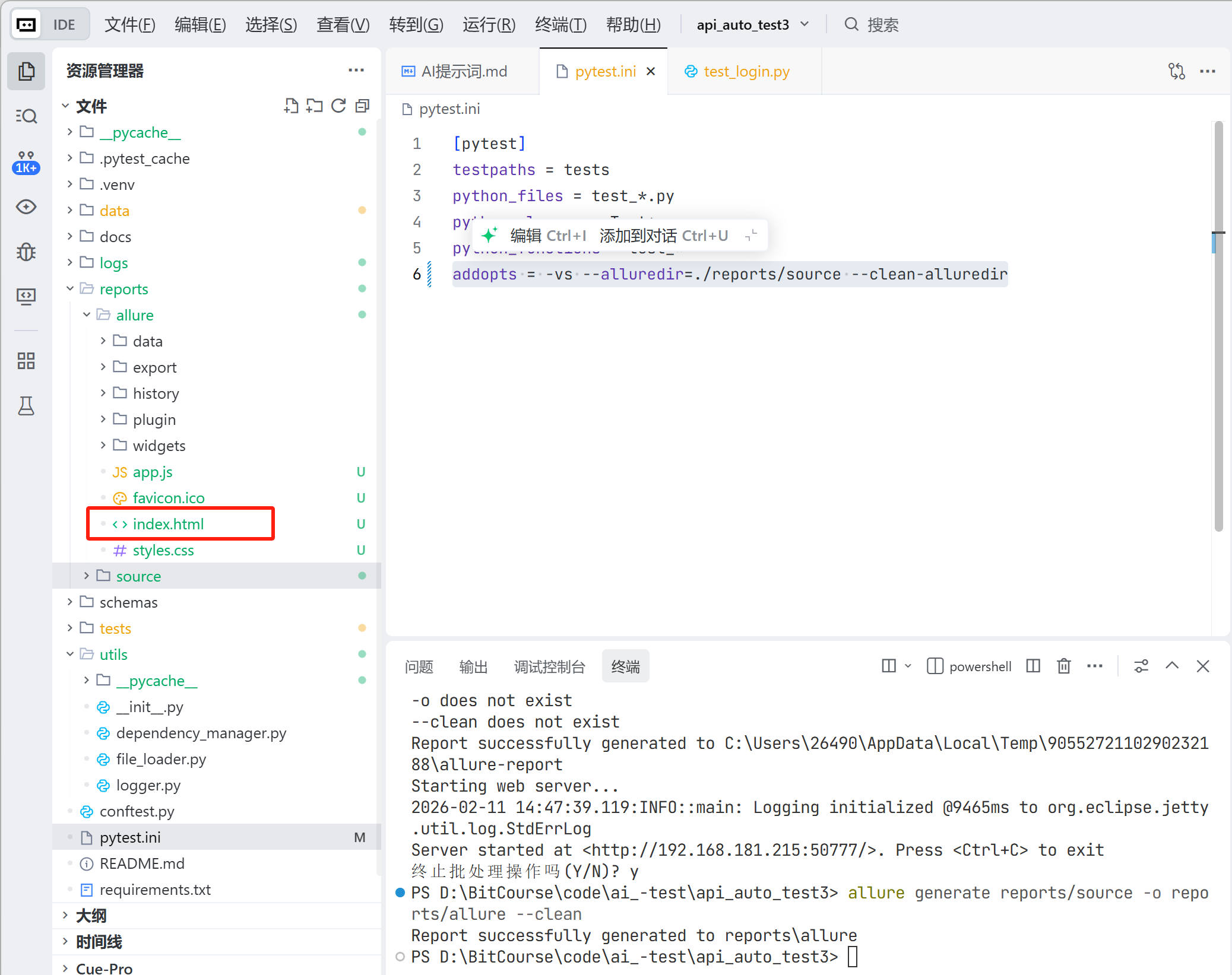 pytest.ini 文件,更改 pytest 运行指令配置,生成测试源数据,并清除之前老数据: