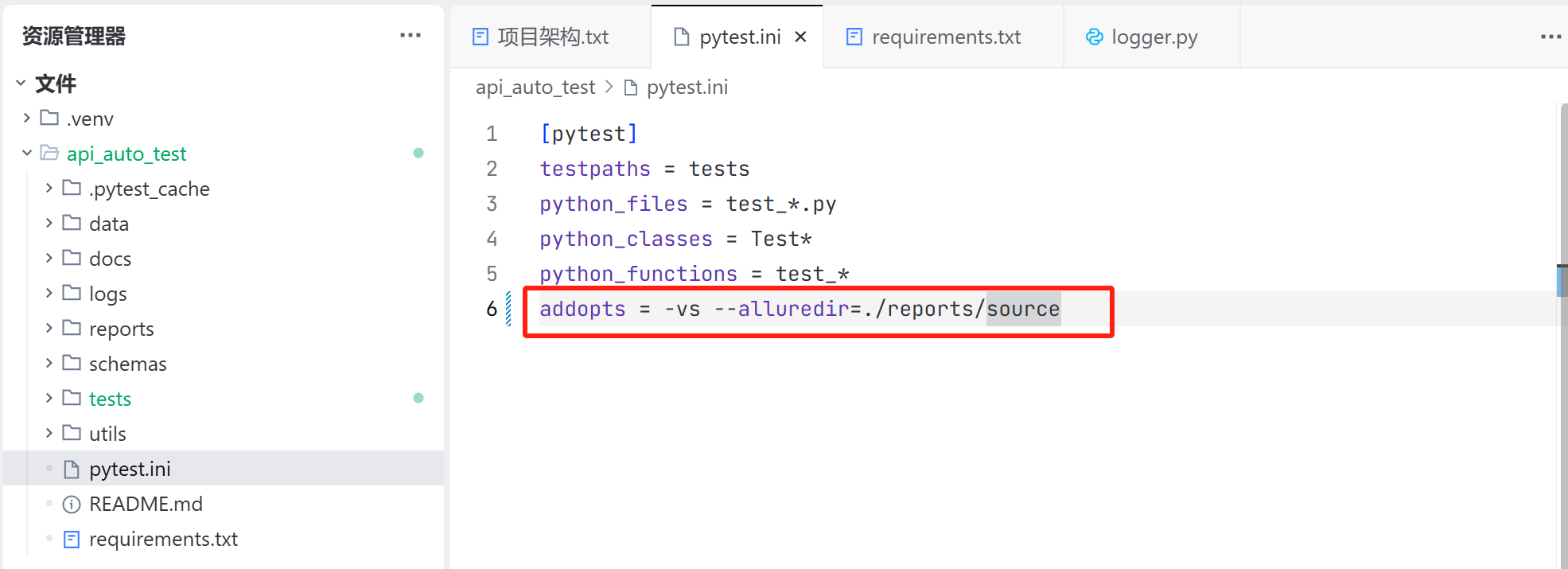 pytest.ini 文件用于配置 pytest 框架测试用例的收集规则,以及默认测试命令的执行内容;