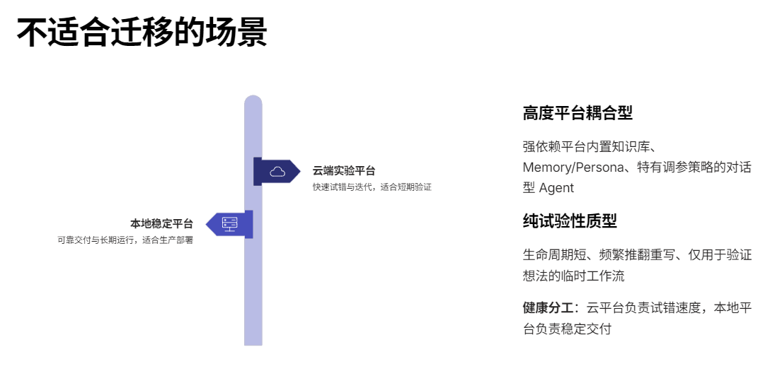 如果一个 Agent只为了验证一个想法,用完一周就可能被废弃,而且还在频繁推翻重写那它非常适合留在云平台上。云平台负责"试错速度",本地平台负责"稳定交付"------这是一个非常健康的分工。