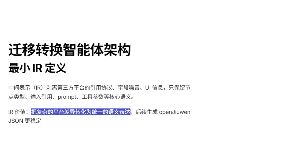 IR 的价值在于:把第三方平台的引用协议、字段噪音、UI 信息全部剥离掉。只要能得到 IR,后面生成 openJiuwen JSON 就稳定很多。