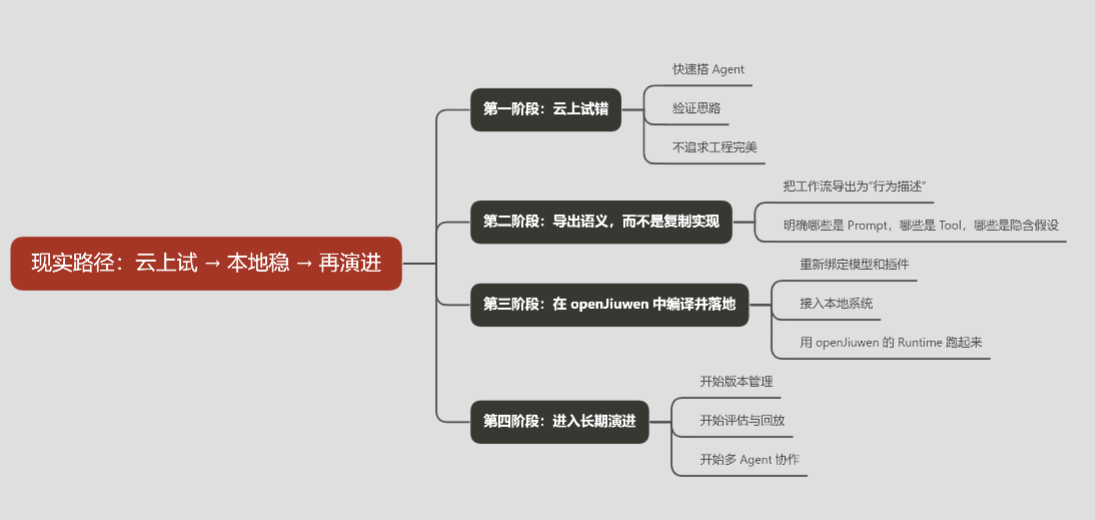 在这条路径里,openJiuwen 并不是"替代云平台",而是承接"已经被验证过的智能体语义",让它们以工程化的方式长期存在。
