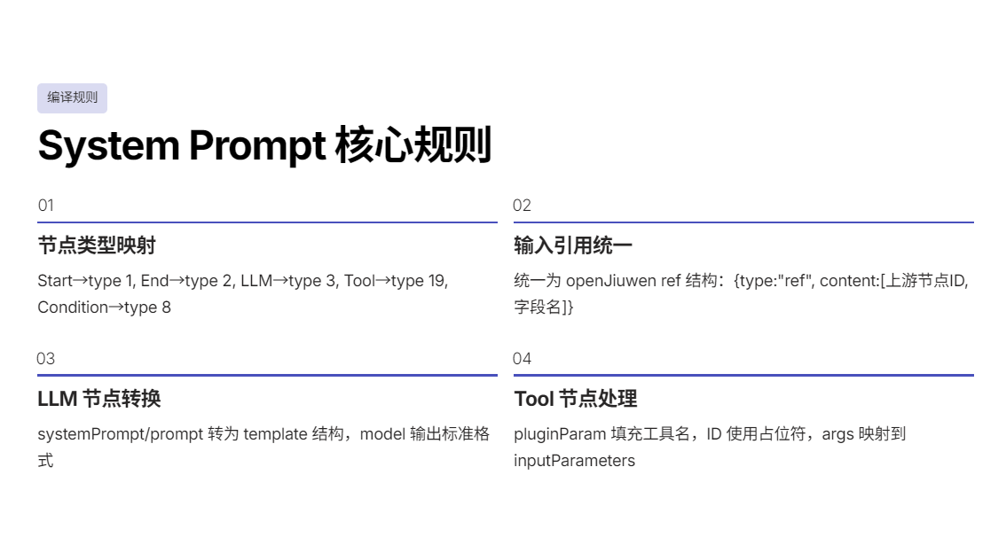 你可以在 openJiuwen 里建一个"LLM 节点",systemPrompt 写成下面这样:
