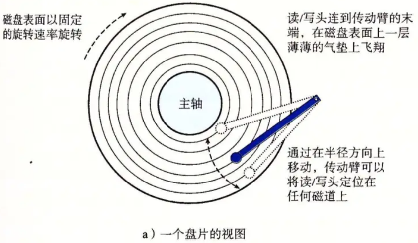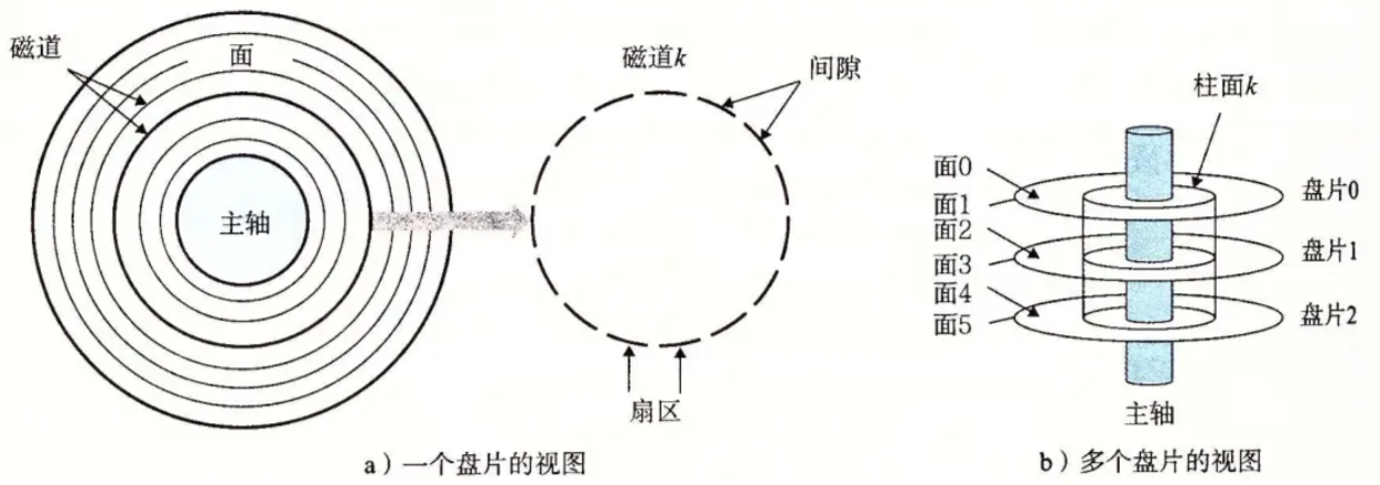 扇区 是从磁盘读出和写入信息的最小单位,通常大小为 512 字节。磁头数 :每个盘片一般有上下两面分别对应1个磁头,每个盘片共2个磁头。磁道数 :磁道是从盘片外圈往内圈编号0磁道,1磁道等等,靠近主轴的同心圆用于停靠磁头,不存储数据。柱面数 :磁道构成柱面,数量上等同于磁道个数。扇区数 :每个磁道都被切分成很多扇形区域,每道的扇区数量相同。圆盘数 :就是盘片的数量。磁盘容量=磁头数 × 磁道(柱面)数 × 每道扇区数 × 每扇区字节数 。细节:传动臂上的磁头是共进退的。