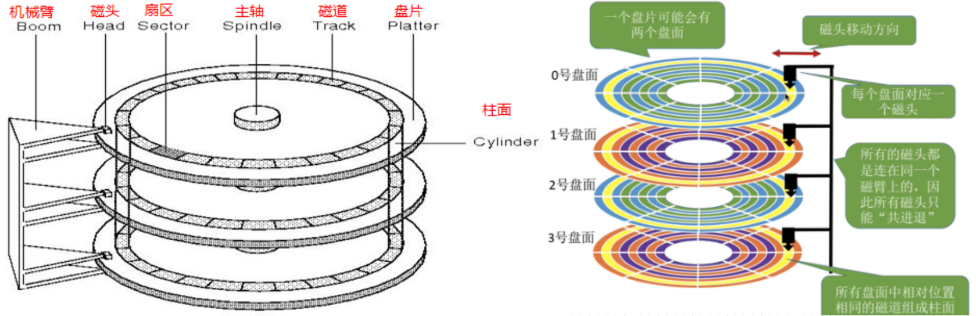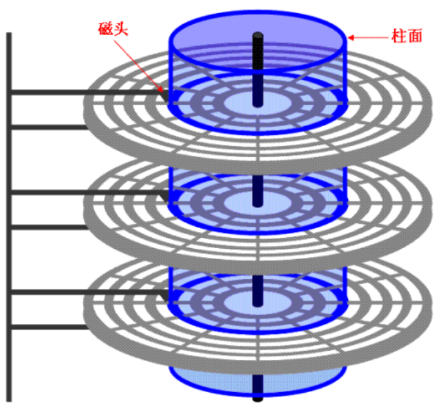 如上面的左图,半径相同的分布在不同的盘片上的磁道共同组成柱面 。