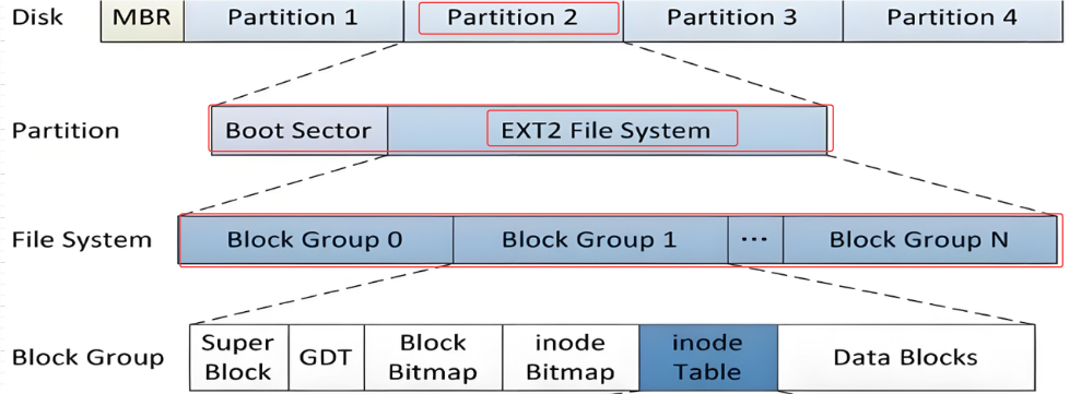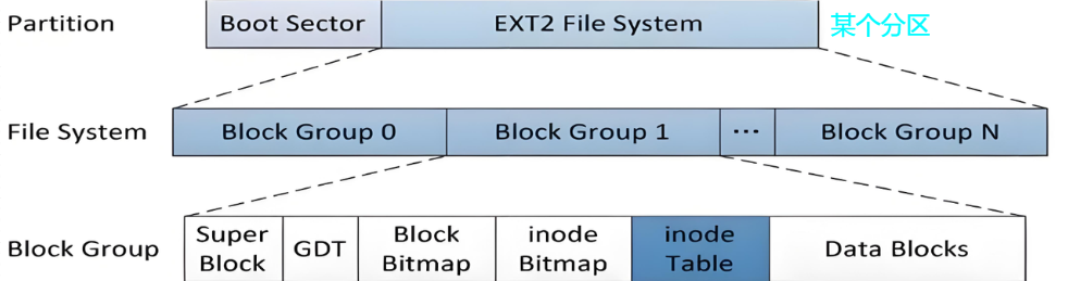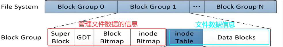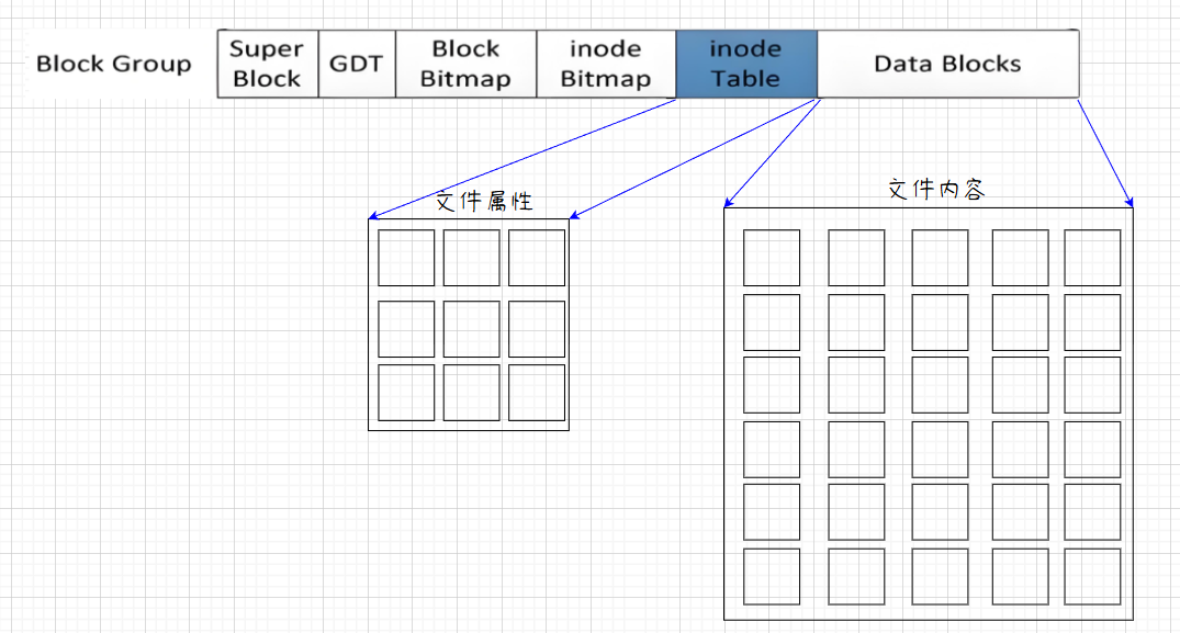 文件 = 内容 + 属性,文件的内容将来在分组的Data Blocks中存储,文件的属性将来在分组的inode Table中存储。它们里面都是很多4kb为单位的小块。所以文件 = Data Blocks + inode Table。
