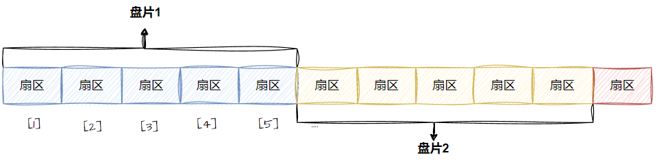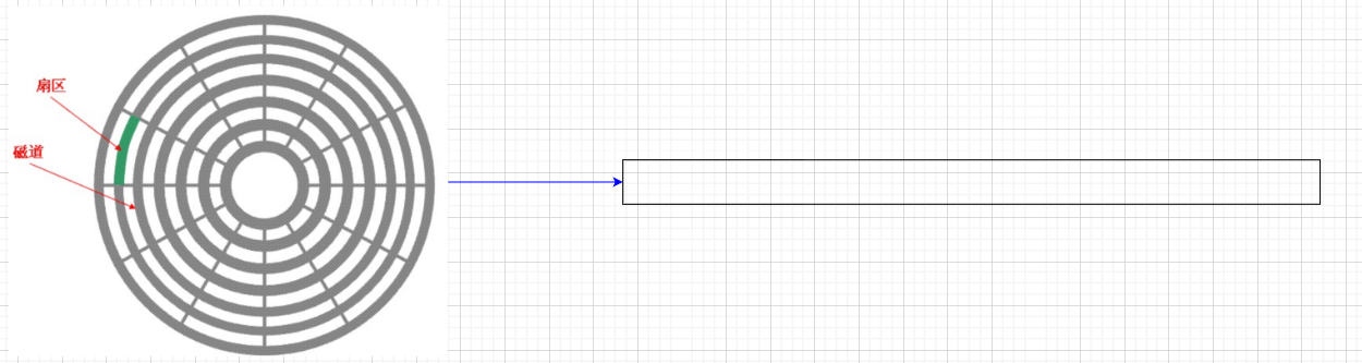 磁带我们都知道,它是一圈一圈的用于存储数据,我们可以把它拉成一个长条,而我们的磁盘也是由一个磁道一个磁道组成的,我们也可以抽象的把它拉直,这样就将它抽象成了一个一维数组。