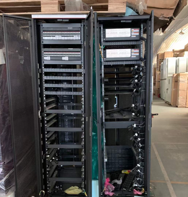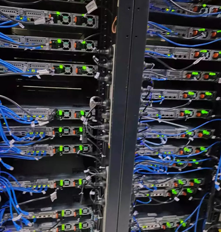 它的背面就可以走线了,服务器只需要把网络线和电源线走好。服务器走线之后就有了一个整机柜,然后将机柜一个一个摆好,网线走好,路由器嫁接好,电灯空调一装就是机房了。