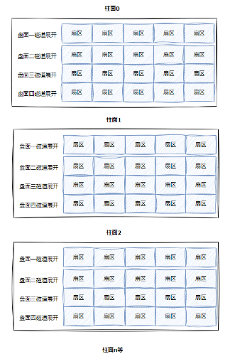 整个磁盘是由很多个柱面构成的,把它展开之后就是一个个二维数组构成的,所以磁盘可以抽象成一个三维数组 。
