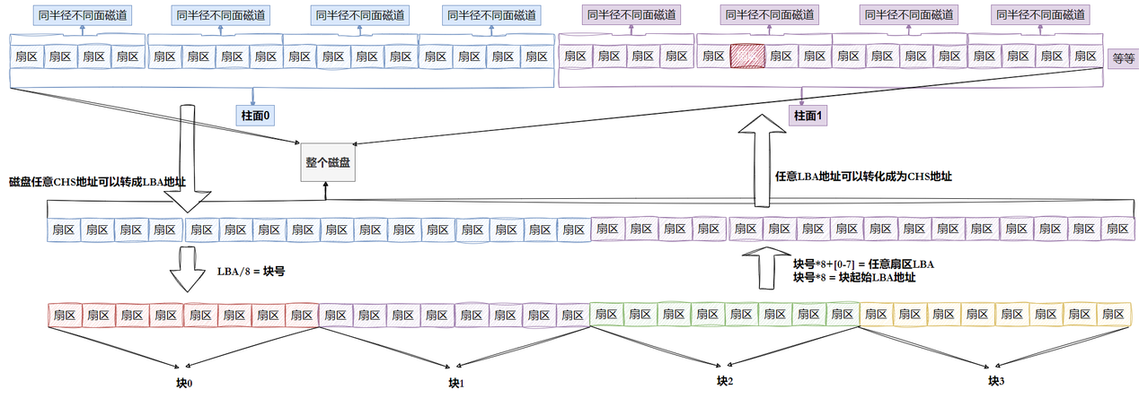 每个扇区都有自己的LBA地址,一个扇区512字节,那么8个扇区就是一个块,所以每一块的地址我们也能算出来,块号 = LBA / 8。那么LBA = 块号 * 8 + k(0=<k<=7)。