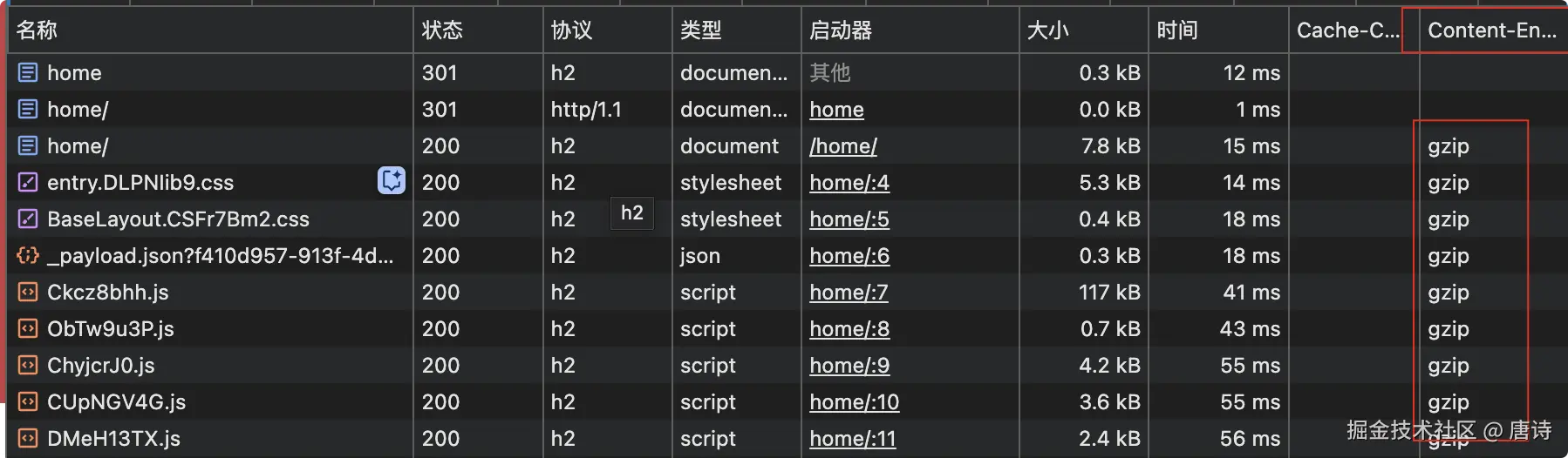调试面板这样显示表示 gzip 配置成功!