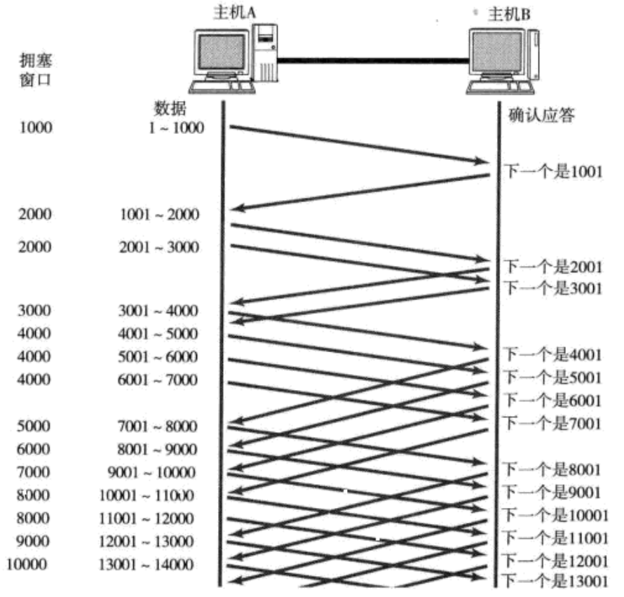 - 窗口大小指的是无需等待确认应答而可以继续发送数据的最大值。上图的窗口大小就是4000个字节(四个段)。