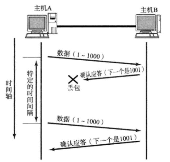 - 如果主机A在一个特定时间间隔内没有收到B发来的确认应答,就会进行重发;