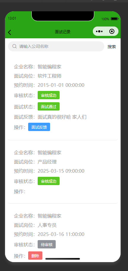 面试记录展示与操作 展示用户的面试记录(含企业名称、面试岗位、预约时间、审核状态、面试状态、面试反馈等信息),支持搜索、提交面试反馈、删除面试记录等操作