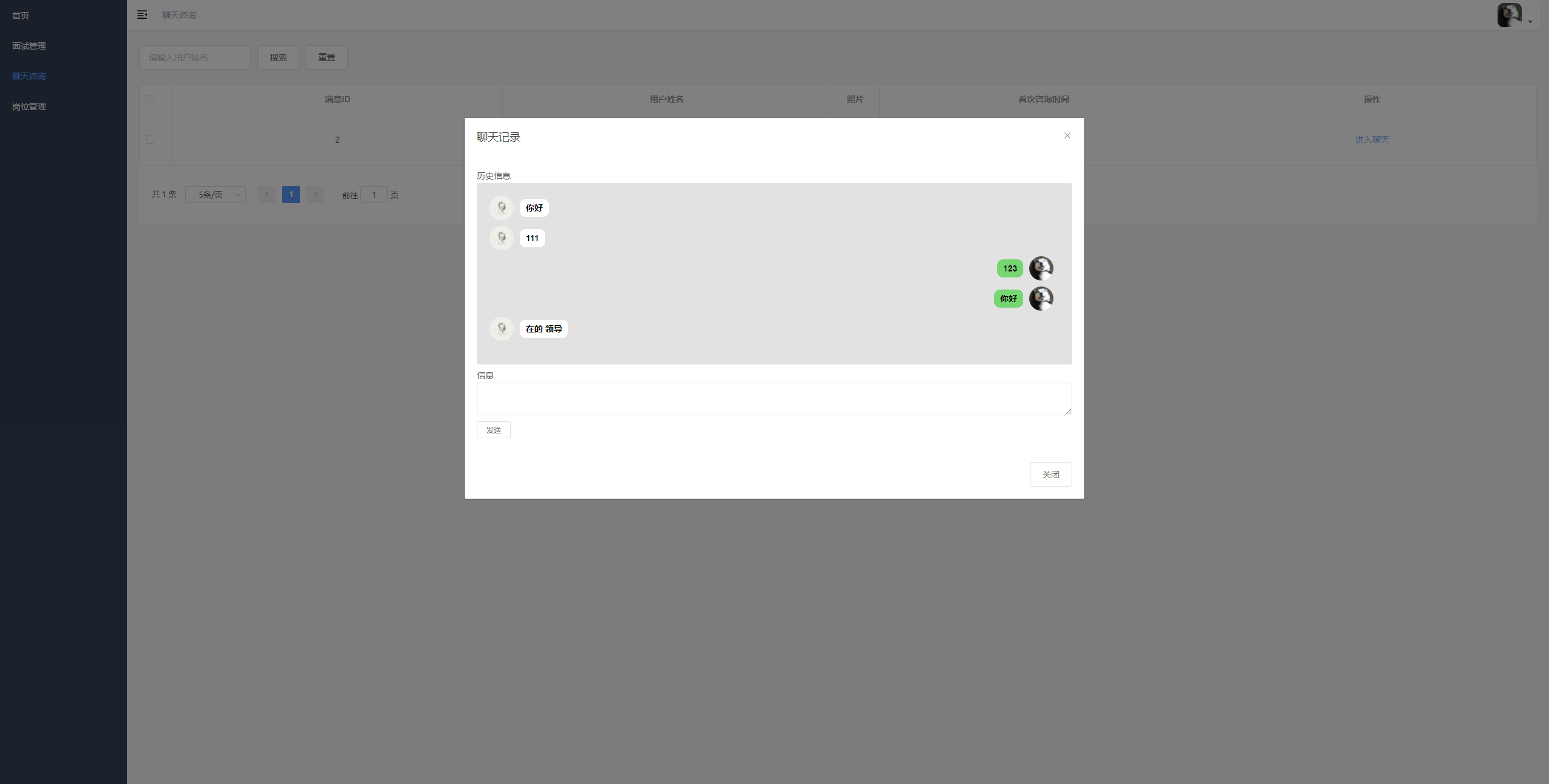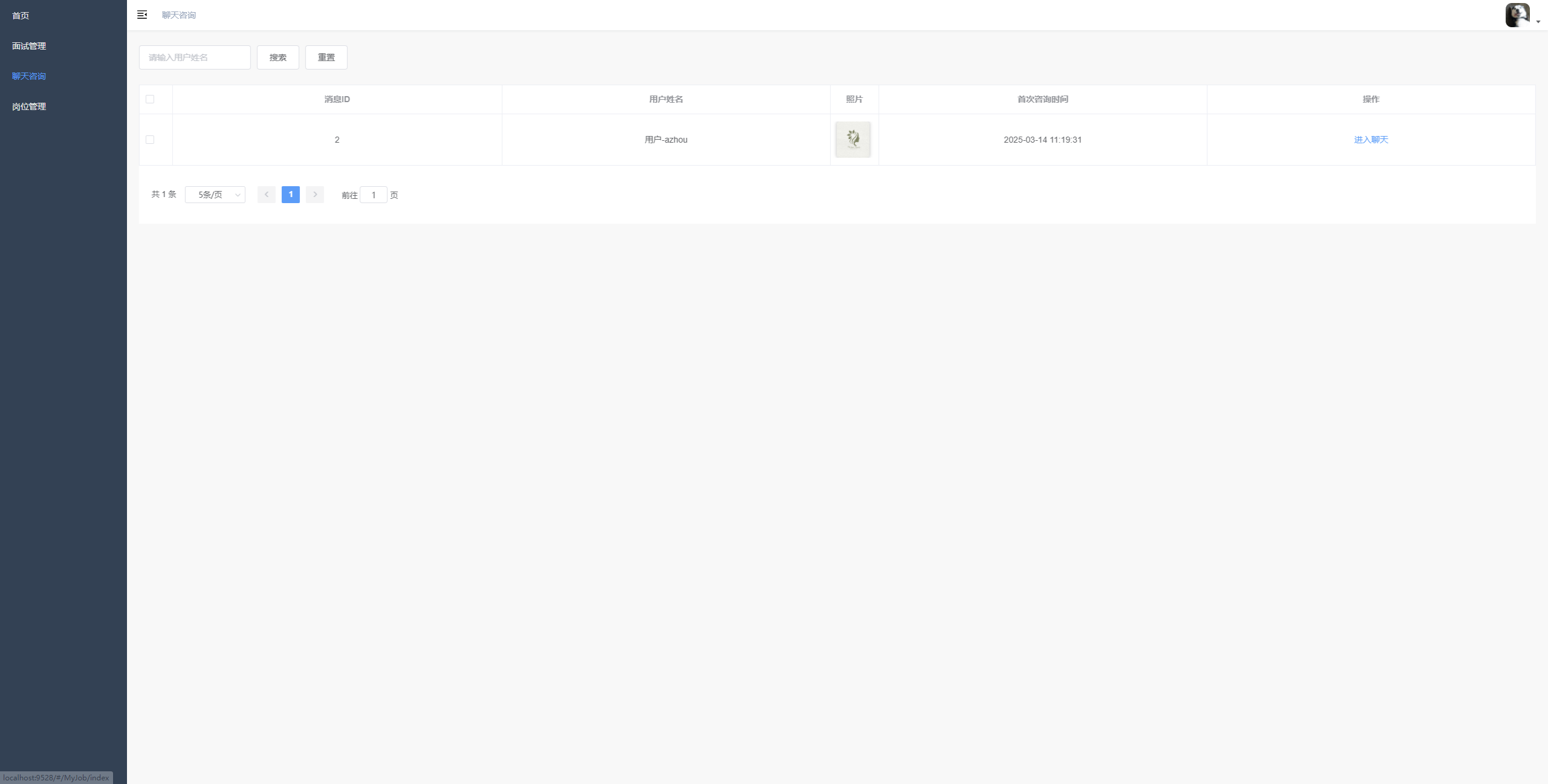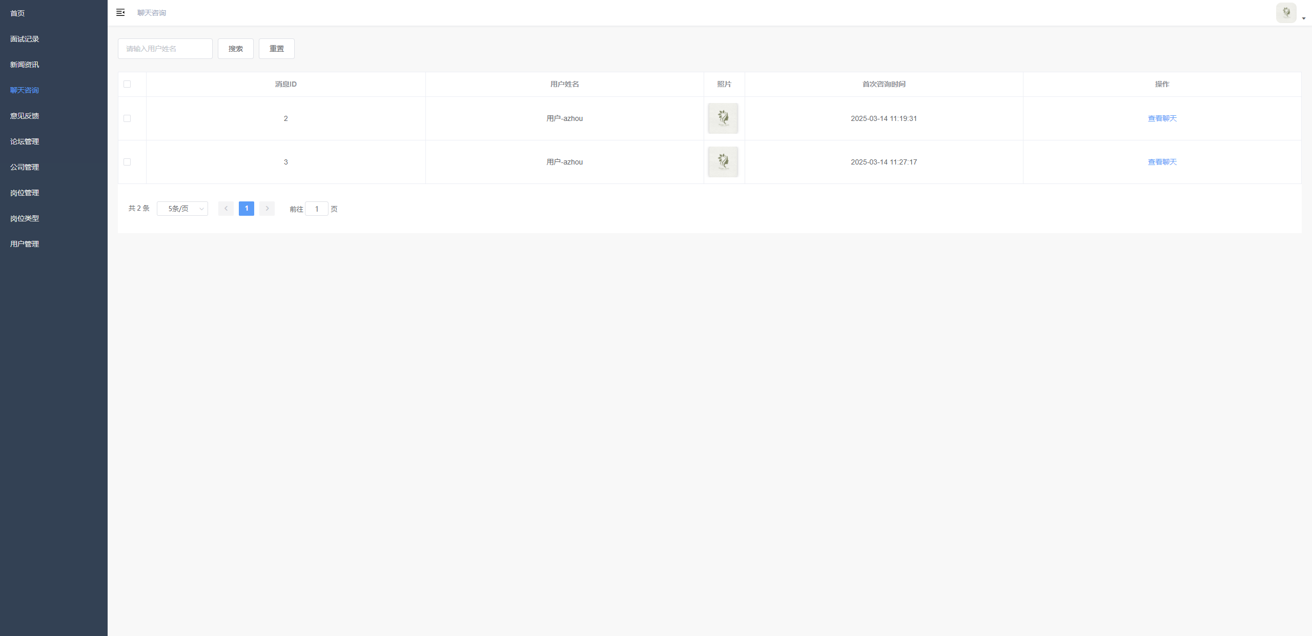 聊天咨询列表管理与聊天入口 展示咨询用户的信息列表,支持按用户名搜索,提供进入与用户聊天的操作,包含分页功能
