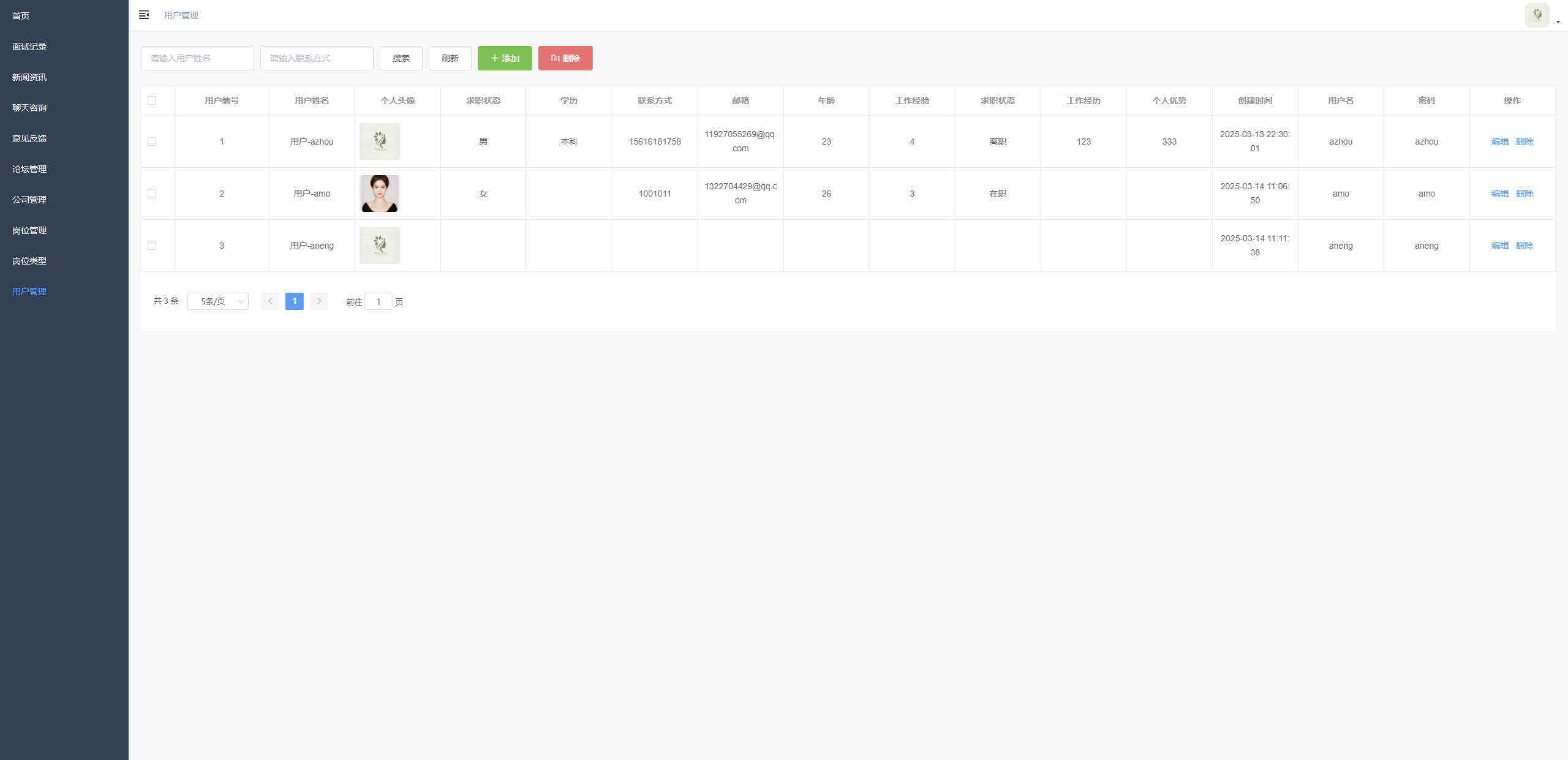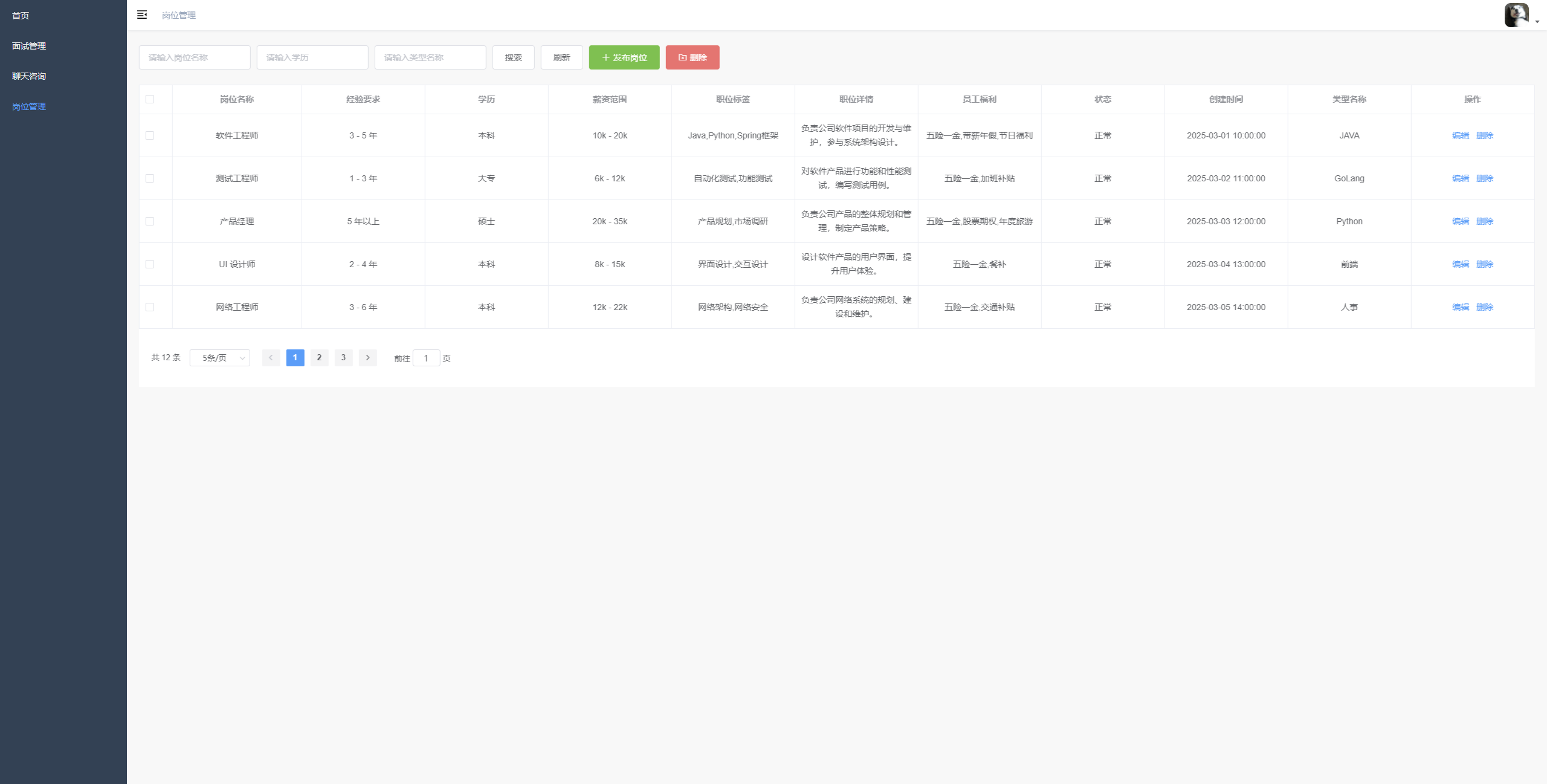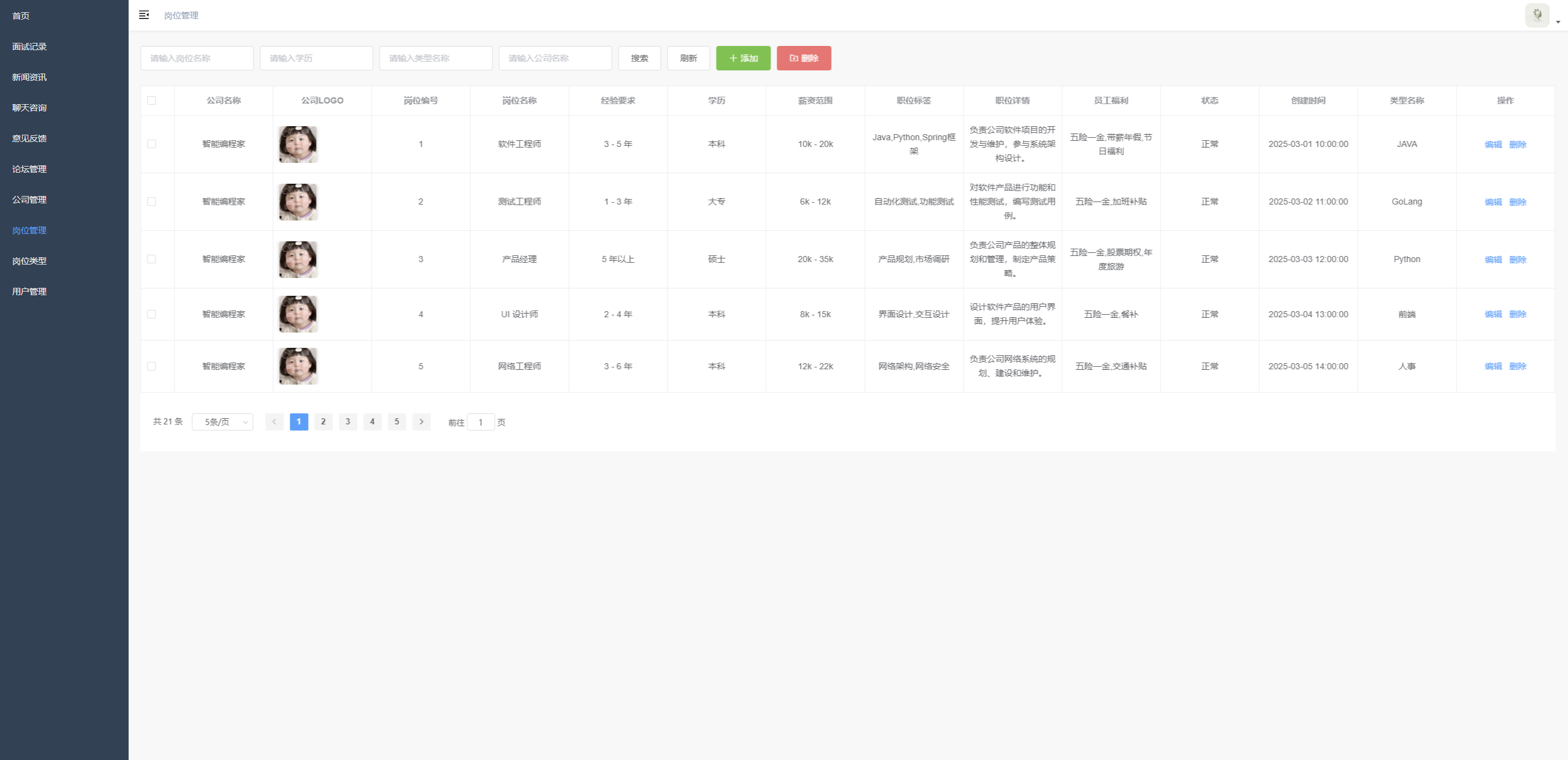 岗位信息管理 支持岗位信息的多条件查询、新增、编辑、删除操作,展示岗位详细信息(含公司、岗位编号、学历、薪资等),提供分页浏览功能