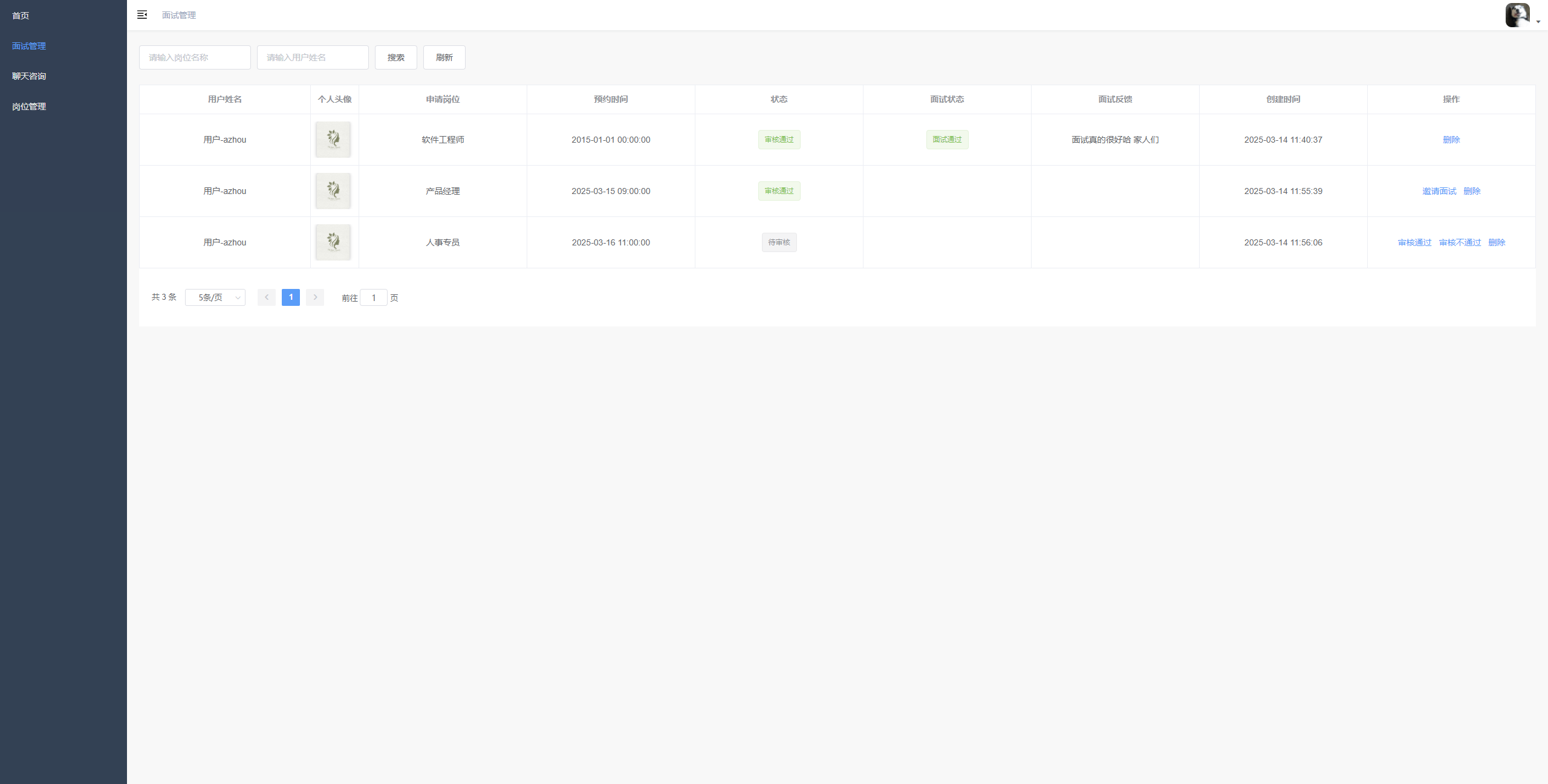 面试申请管理 支持按岗位名称、用户姓名查询面试申请记录,分页展示记录详情(含用户信息、申请岗位、预约时间、状态等),并对记录执行删除、申请面试、审核(通过/不通过)等操作