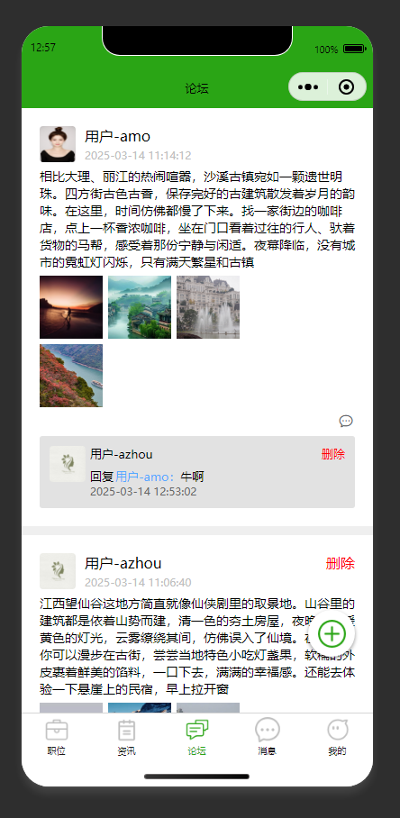 论坛内容展示与用户互动 展示用户发布的图文帖子,支持查看回复、删除个人发布的帖子/回复,提供底部导航切换功能模块
