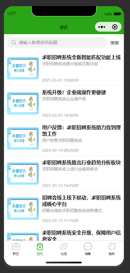 资讯展示与检索 支持输入资讯标题进行搜索,展示多条带标题、时间的资讯条目,提供底部多模块导航切换